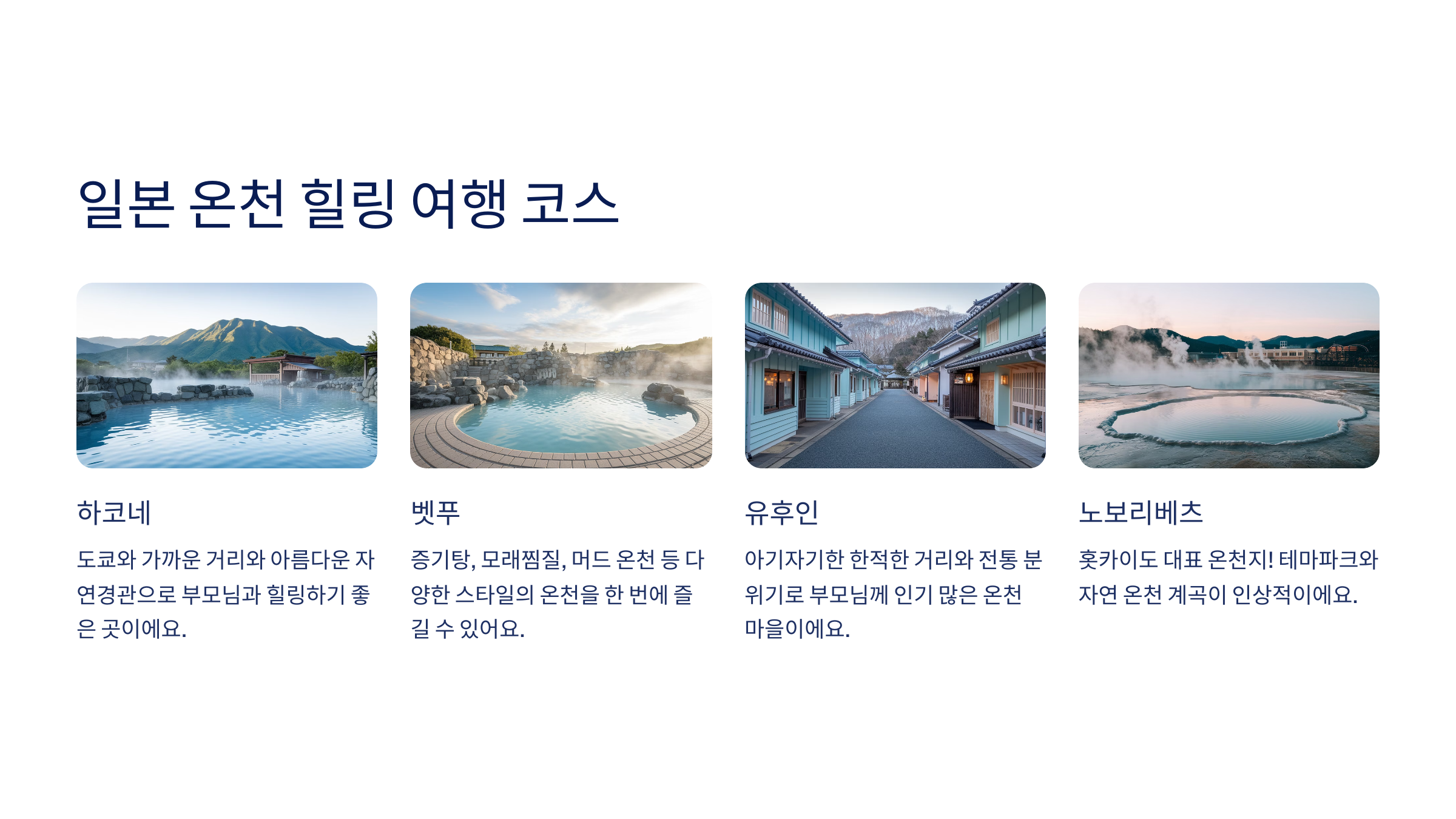 이제 본격적으로 효도 여행에 어울리는 일본 지역과 테마를 알아볼 시간이에요. 온천, 전통, 도시 탐방, 맛집 등 다양한 테마 중 부모님께 딱 맞는 스타일을 골라보세요.😊