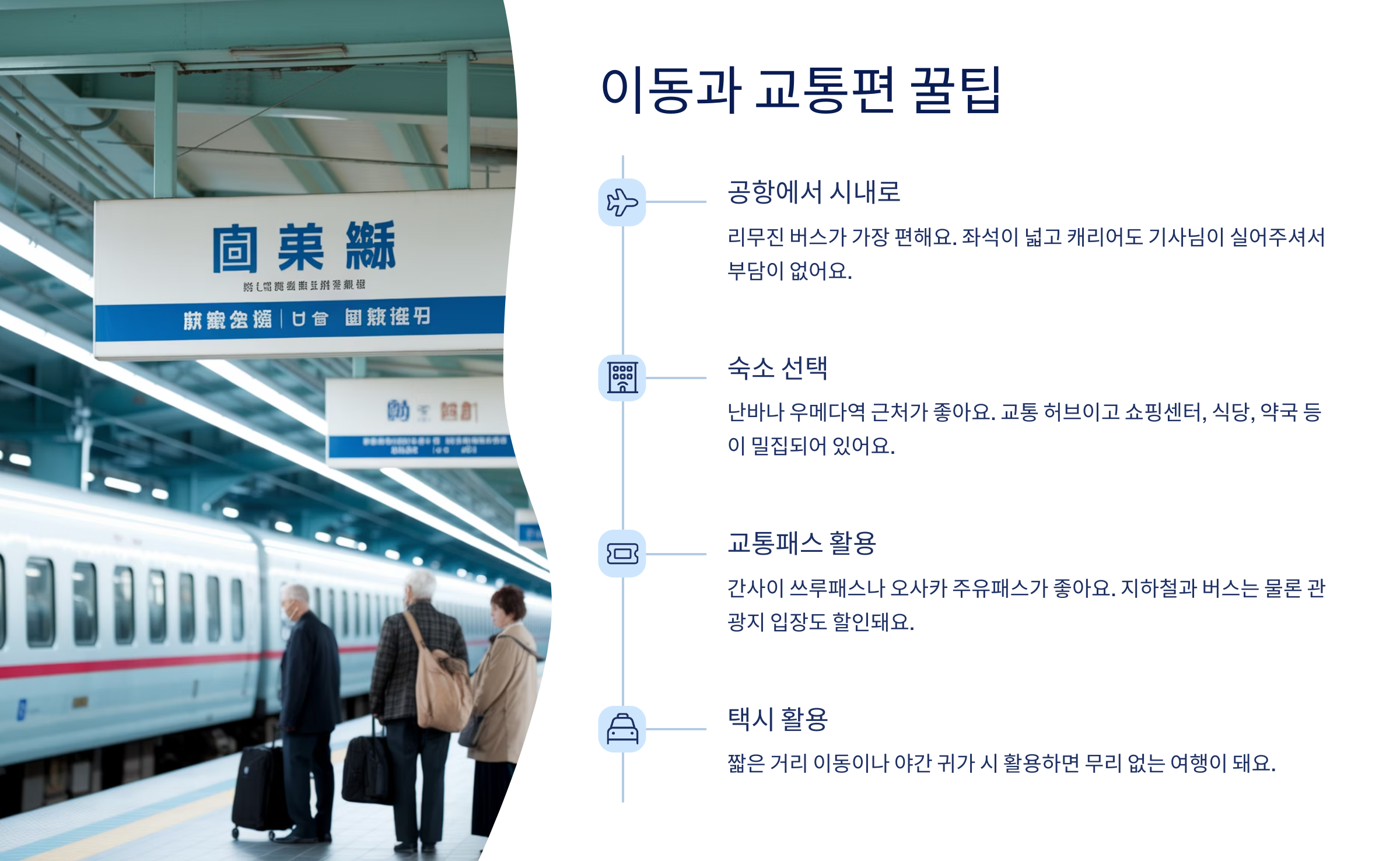 오사카 효도여행의 성공 여부는 ‘교통’을 어떻게 구성하느냐에 달려 있다고 해도 과언이 아니에요. 부모님과 함께라면 최대한 덜 걷고, 쉽게 갈 수 있는 노선을 짜는 게 핵심이에요 🚶♀️🚌