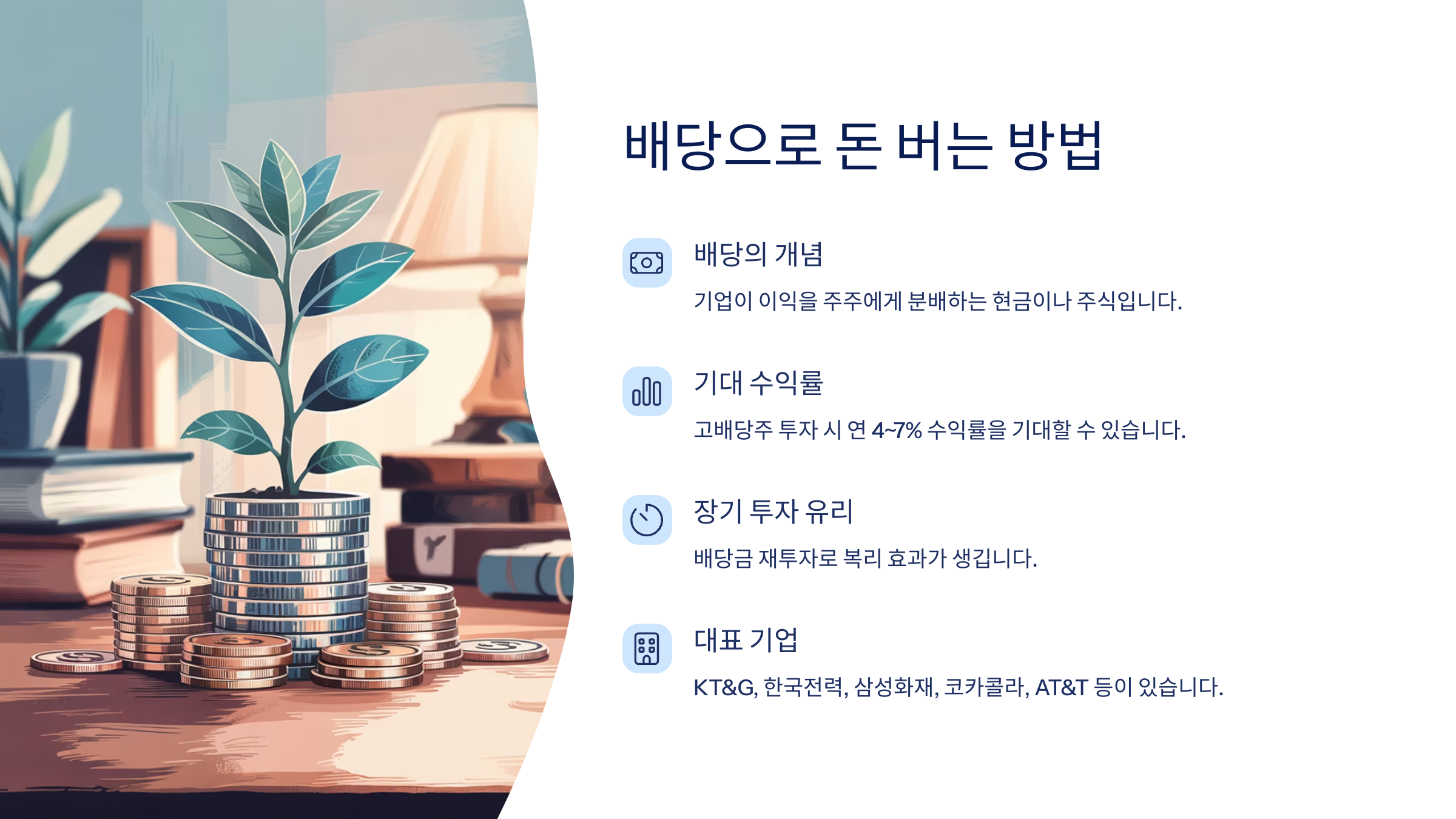 특히 ‘고배당주’에 투자하면 연 4~7% 정도의 수익률을 기대할 수 있어요. 대표적인 고배당 기업으로는 KT&G, 한국전력, 삼성화재 같은 기업이 있어요. 미국 시장에서는 코카콜라, AT&T, 존슨앤존슨 등이 유명하죠.
