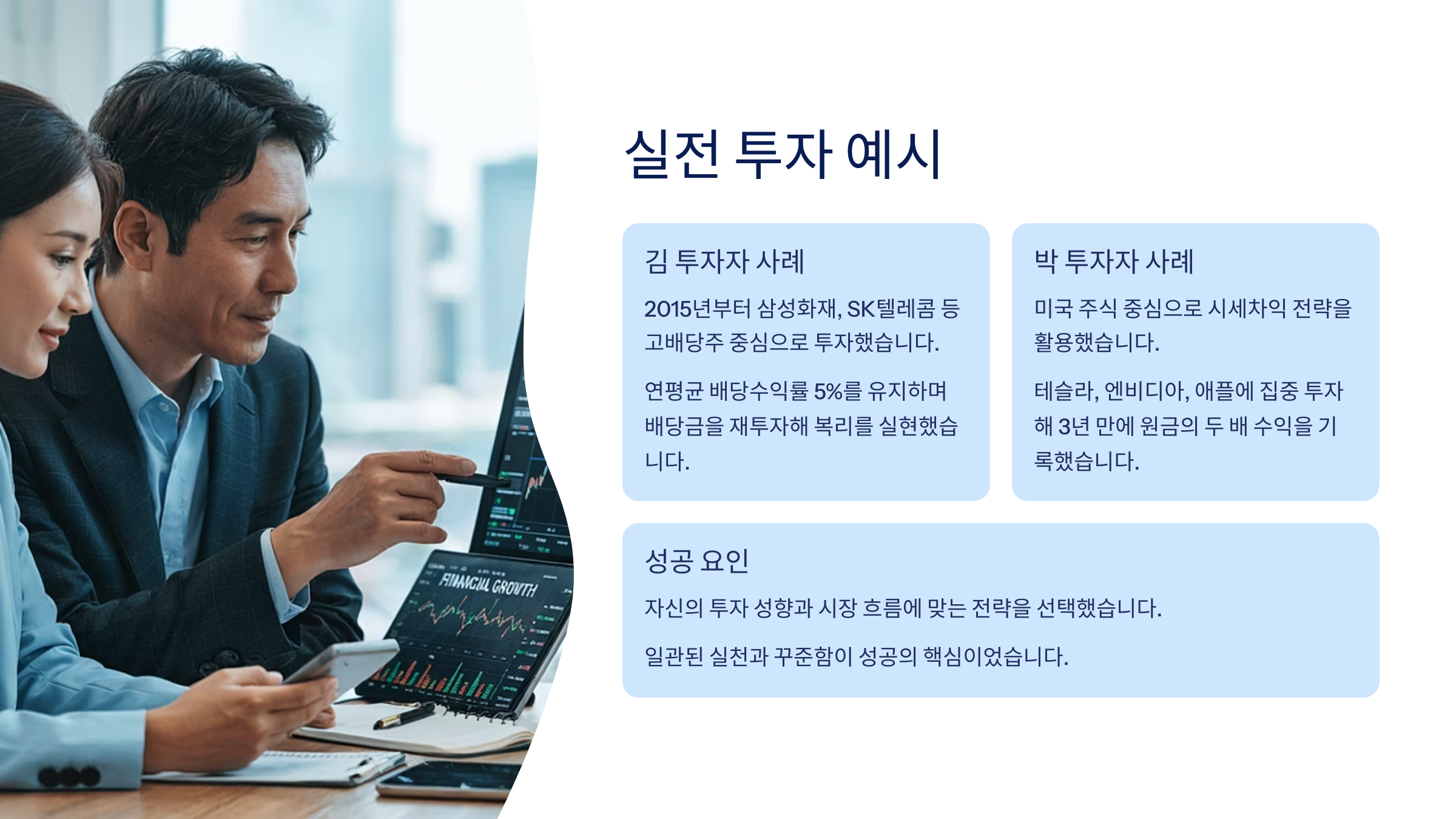 주식으로 자산을 키운 사람들은 어떤 방식으로 배당과 시세차익을 활용했을까요? 예시를 보면 전략이 더 명확해져요. 김 투자자님은 2015년부터 고배당주 중심으로 매수해왔어요. 대표적으로 삼성화재와 SK텔레콤을 오래 보유했죠.