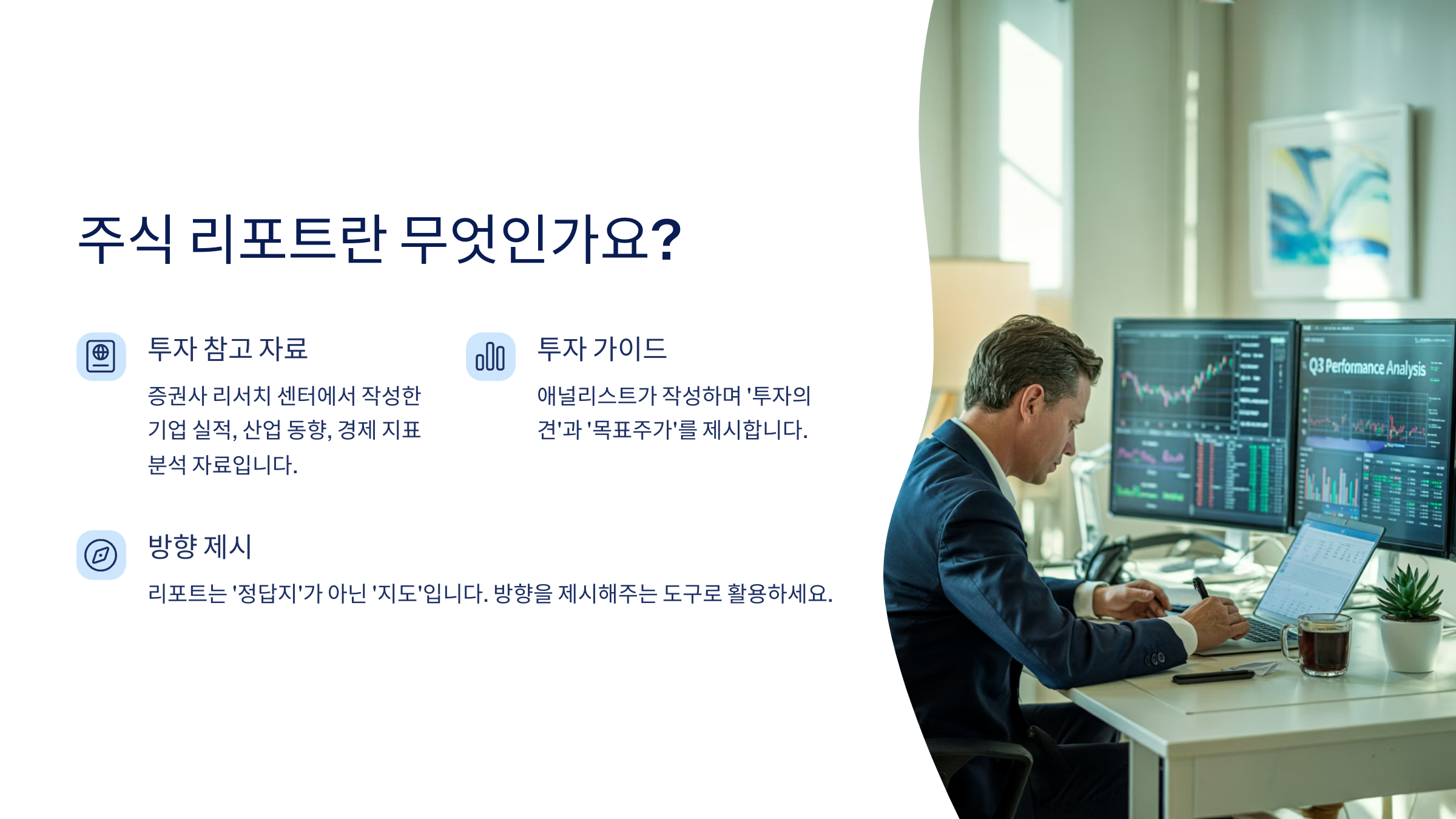 일반적으로 애널리스트(분석가)가 작성하고, '투자의견'이나 '목표주가'와 같은 결론을 제시해요. 즉, 이 회사의 주식을 사야 할지, 팔아야 할지, 그냥 들고 있어야 할지를 알려주는 가이드 같은 거죠.