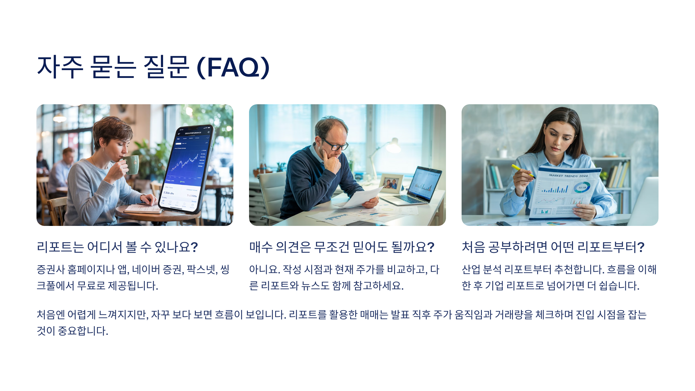 하지만 핵심만 짚어내는 방법을 알면 이 리포트들은 엄청난 무기가 될 수 있어요. 리포트를 제대로 읽으면 투자 타이밍, 주가 흐름, 이슈 대응력까지 한층 업그레이드된답니다!