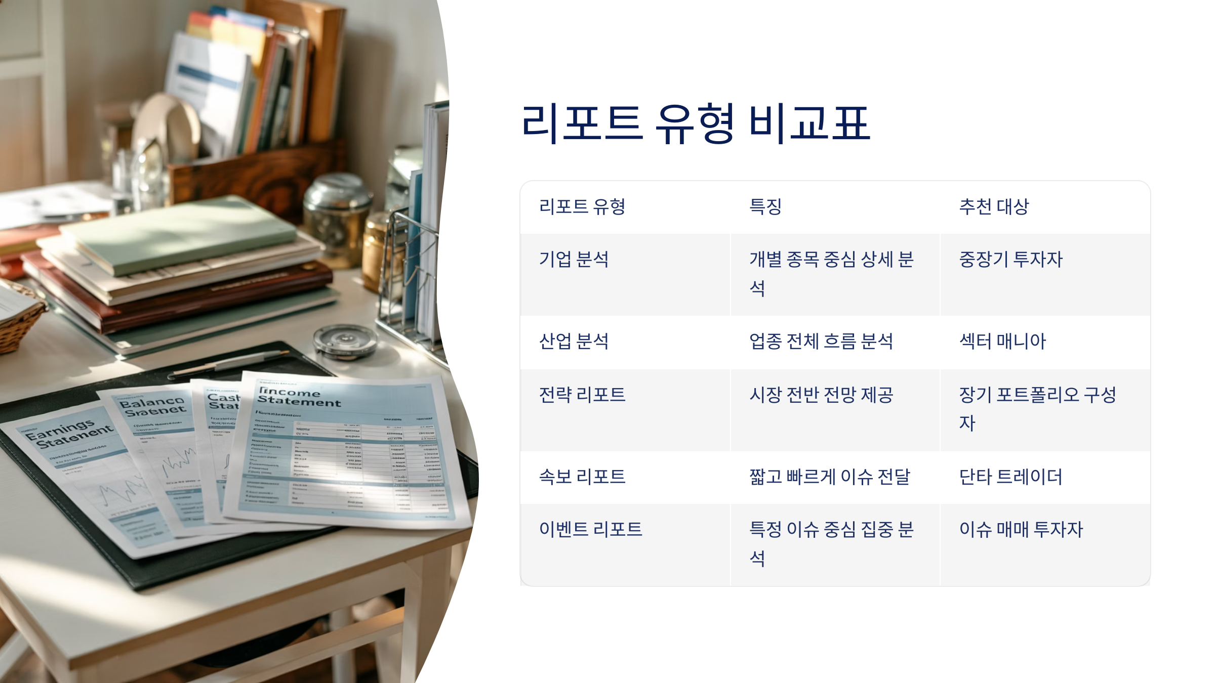 이제 다양한 리포트가 어떤 특징을 갖고 있는지 유형별로 비교해볼 차례예요. 매수 판단 전에 어떤 리포트가 자신에게 맞는지도 중요하거든요!