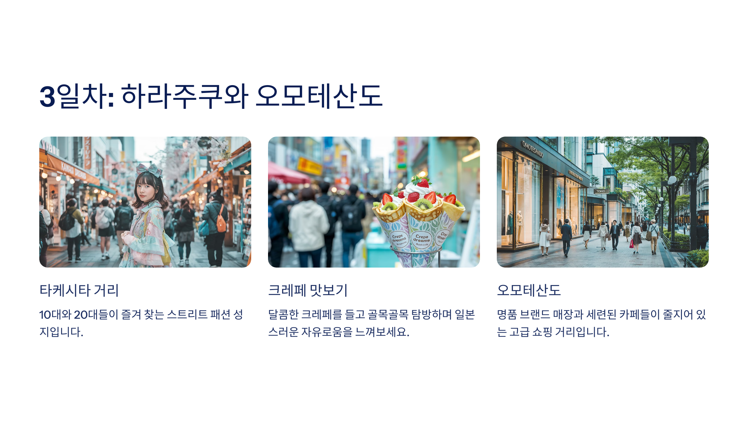 도쿄 자유여행 셋째 날은 트렌디함과 고급스러움을 모두 갖춘 하라주쿠와 오모테산도 지역을 돌아볼 거예요! 젊음과 패션, 예술이 넘치는 거리라서 걷기만 해도 에너지가 샘솟는 느낌이에요. ✨