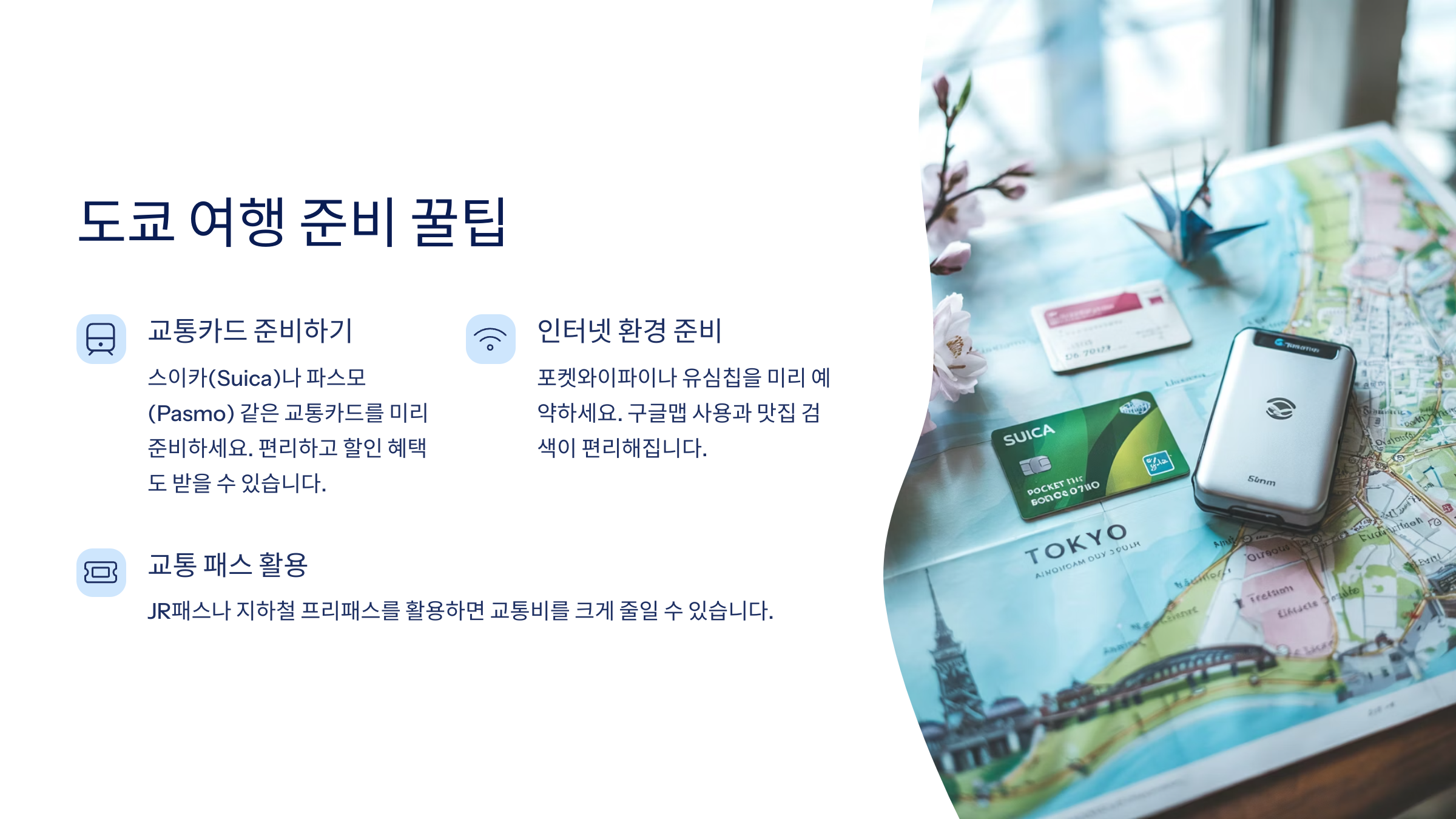 첫 번째는 교통카드 준비하기! 일본은 교통비가 비싸기로 유명하니까, 스이카(Suica)나 파스모(Pasmo) 같은 교통카드를 미리 준비하면 편리하고 할인 혜택도 받을 수 있어요. 공항이나 편의점에서도 쉽게 구할 수 있답니다. 🚃