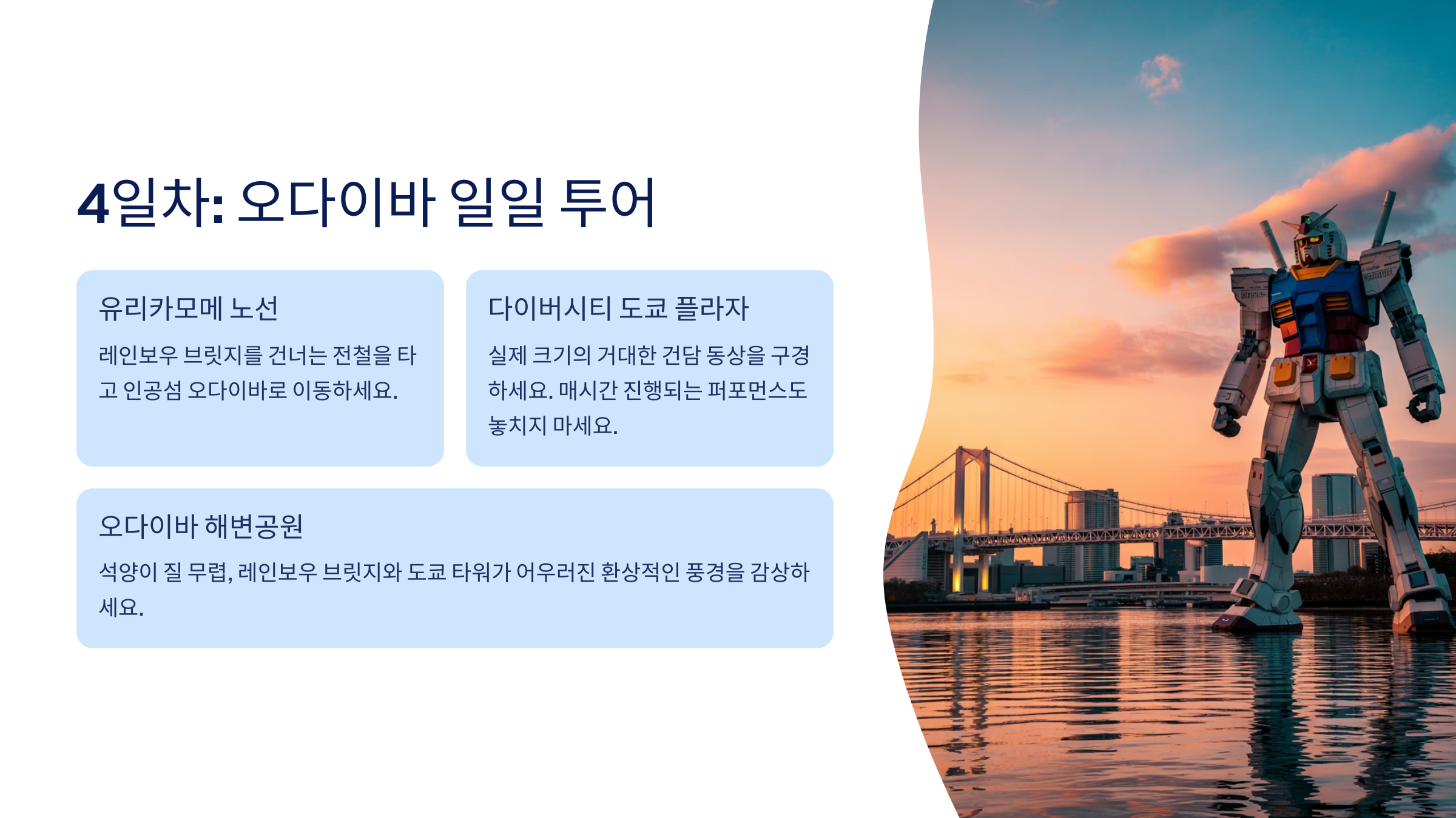 도쿄 자유여행 넷째 날은 바다와 함께하는 도시, 오다이바에서 하루를 보내는 걸 추천해요! 대형 쇼핑몰, 테마파크, 해변 산책로까지 한꺼번에 즐길 수 있는 완벽한 하루 코스랍니다. 🌊