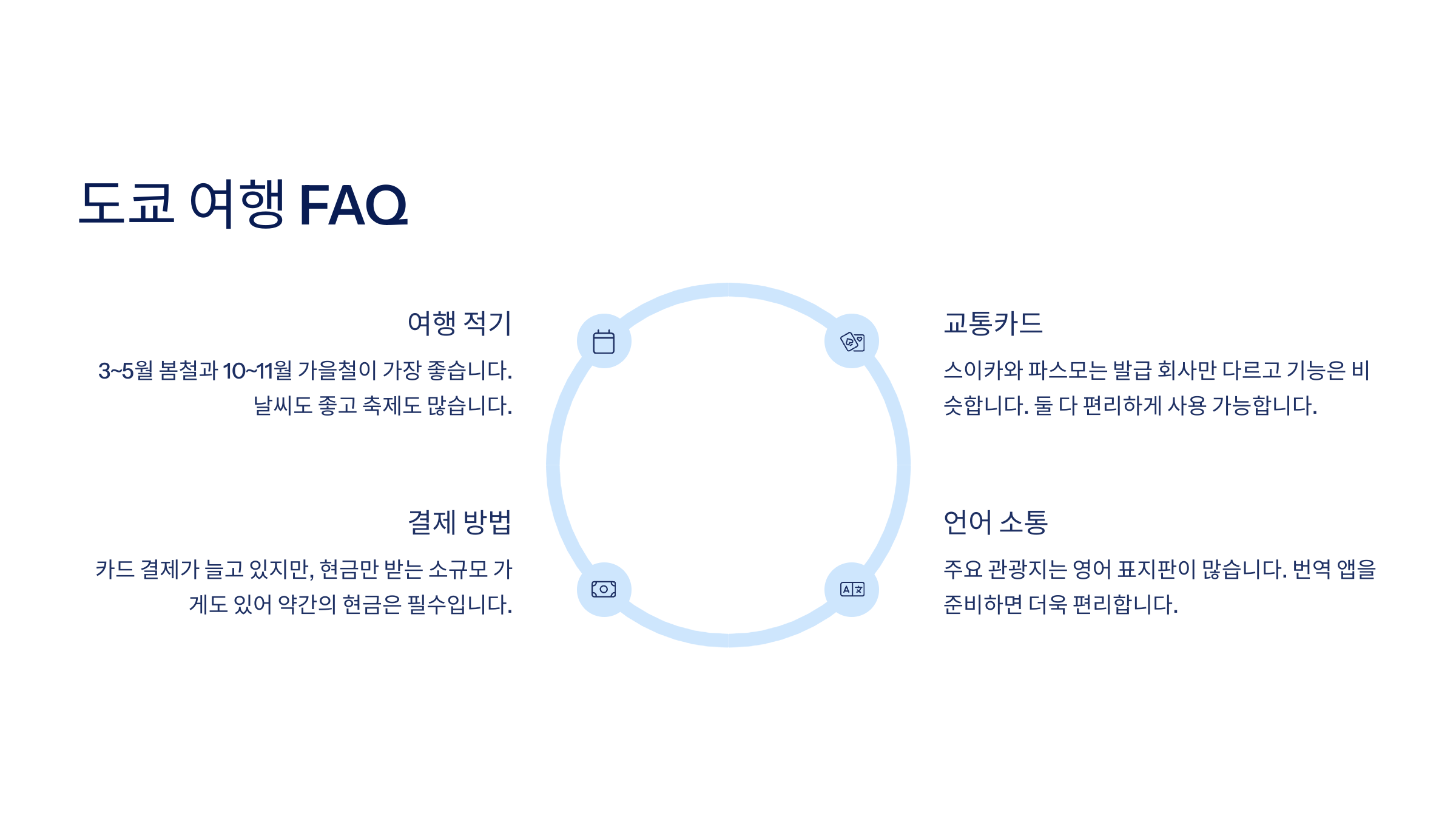 A3. 주요 관광지는 영어 표지판이 많고, 기본적인 영어로 소통이 가능해요! 번역 앱도 준비해가면 완벽해요. 📱