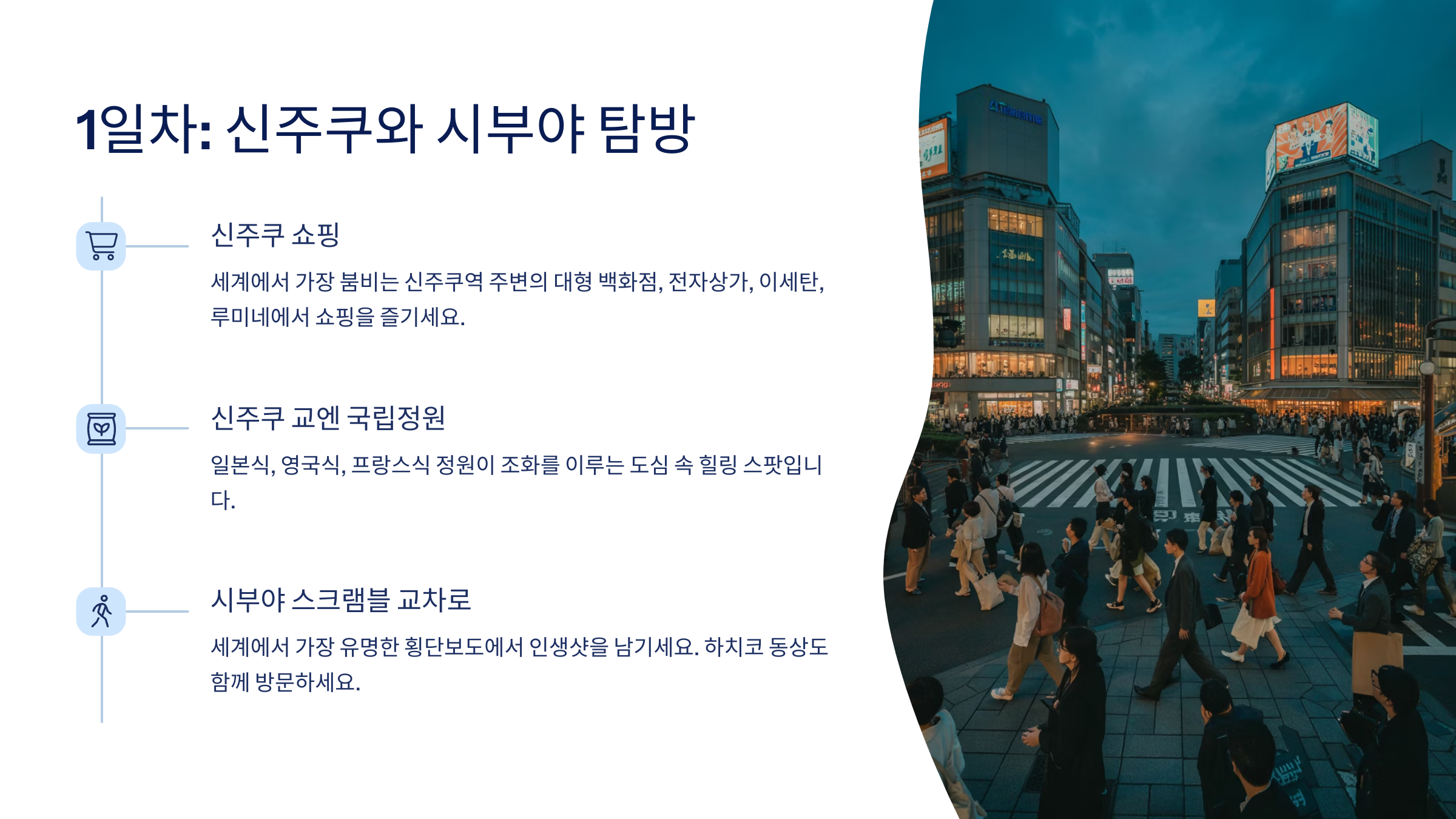 도쿄 자유여행의 첫날은 화려하고 에너지 넘치는 신주쿠와 시부야 지역을 돌아보는 걸 추천해요! 도쿄의 트렌드를 한눈에 느낄 수 있는 곳이니까요. 🏙️