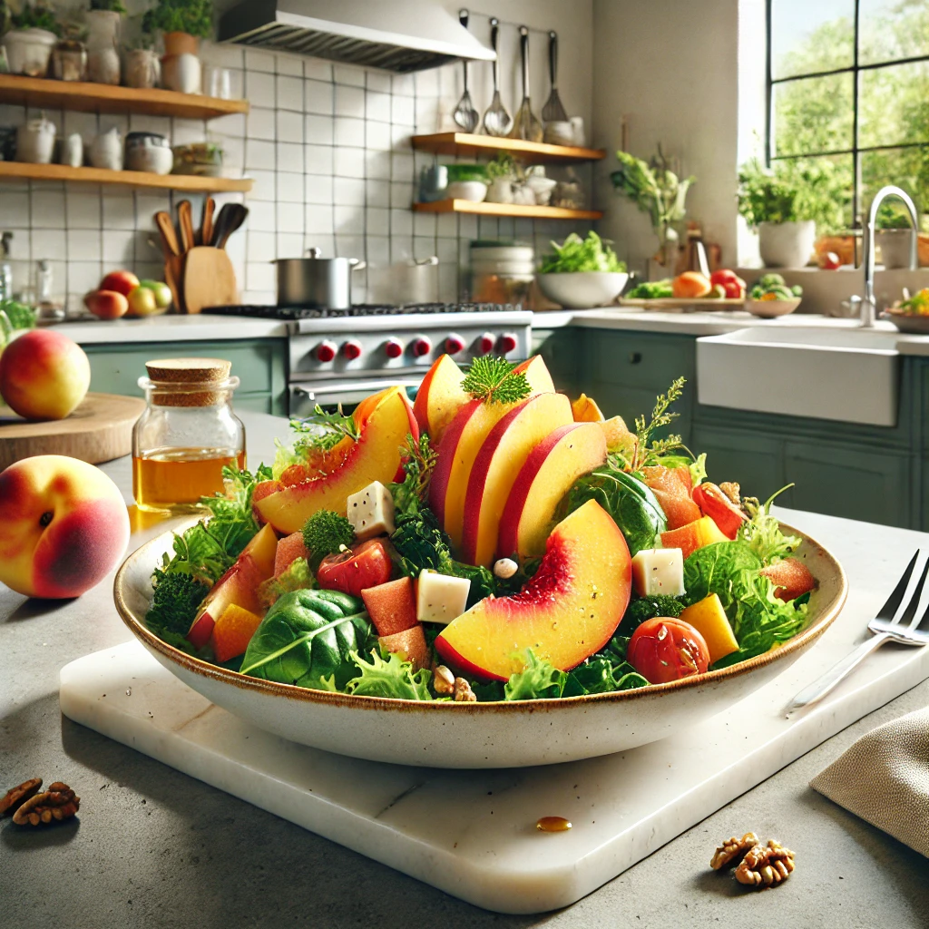 복숭아를 얇게 슬라이스 하여 샐러드에 추가하면 상큼한 맛을 더할 수 있습니다. 다양한 채소와 견과류, 치즈를 함께 섞어 건강한 샐러드를 만들 수 있습니다.
