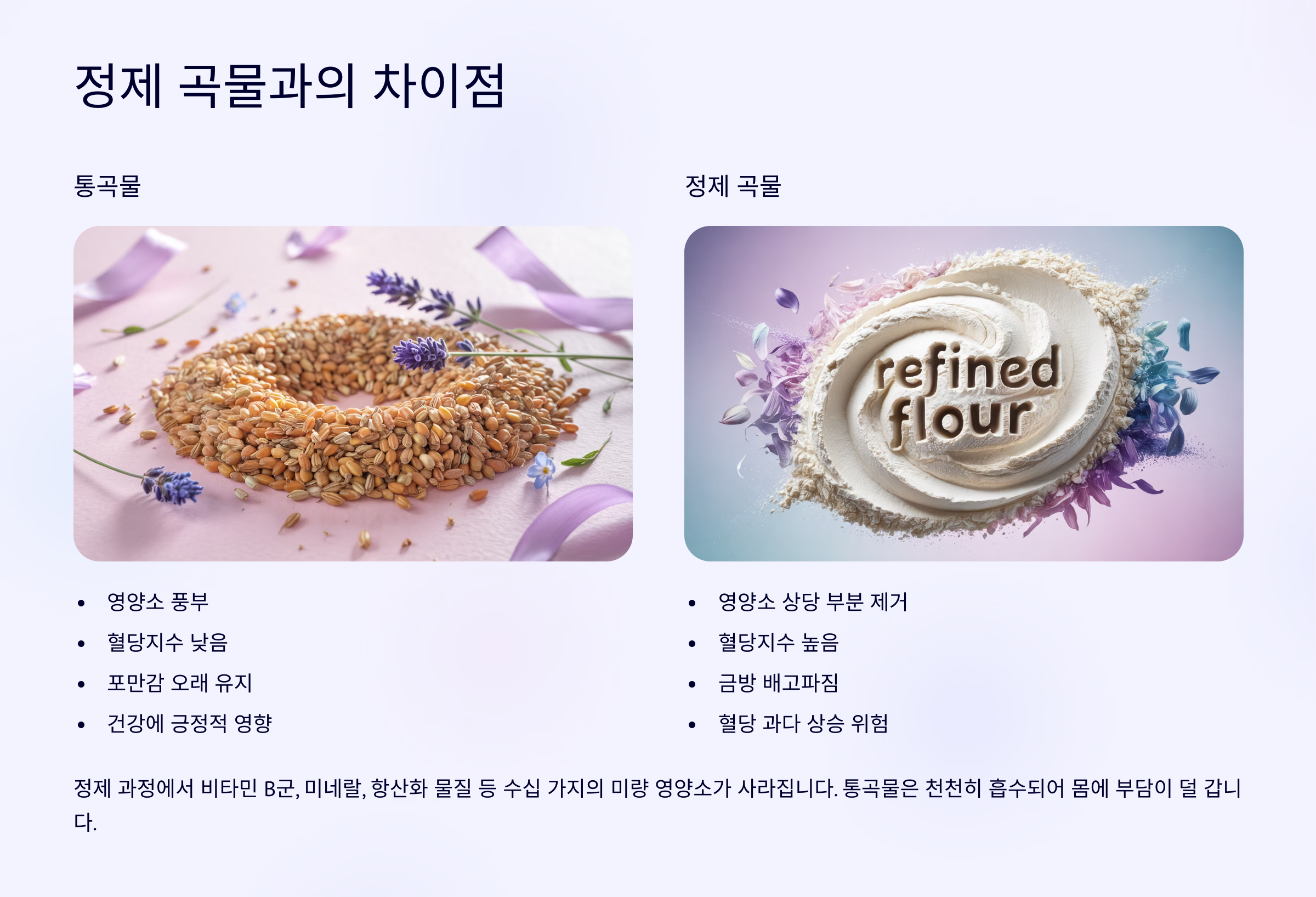 이런 효과들 덕분에 통곡물은 세계 5대 슈퍼푸드 중 하나로 꼽히기도 해요. 🏆 다음 섹션에서는 통곡물과 정제 곡물이 어떤 차이가 있는지 더 깊이 비교해서 알아볼게요!