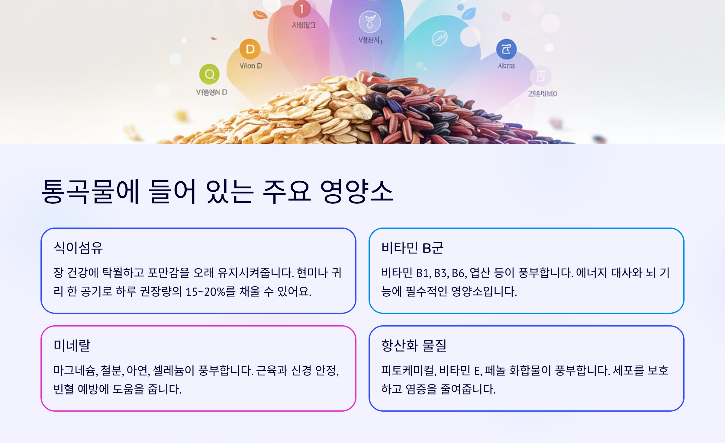 이제 통곡물이 무엇인지 정확히 이해하셨죠? 🌾 다음 섹션에서는 이 통곡물 안에 어떤 영양소들이 가득 들어 있는지, 하나하나 구체적으로 알려드릴게요! 🥣