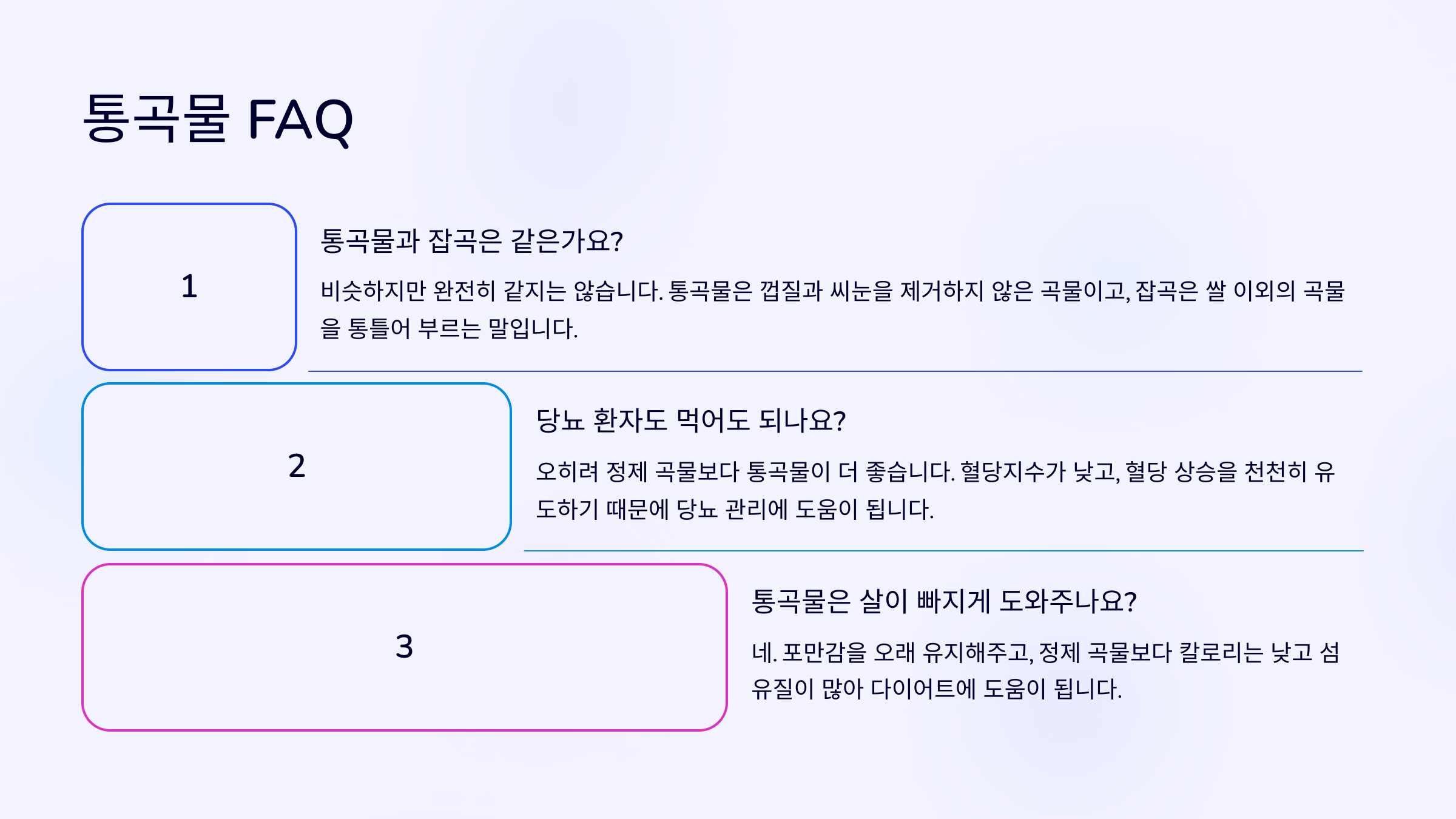 통곡물은 우리 건강을 책임져주는 소중한 식재료예요. 이제 마지막으로, 많은 분들이 궁금해하는 통곡물에 대한 Q&A 8가지 정리해서 알려드릴게요! ❓