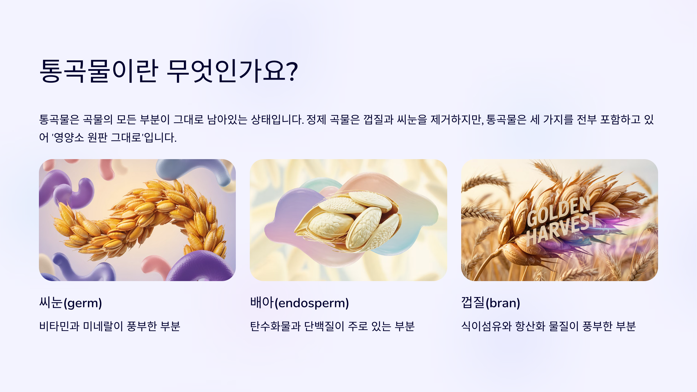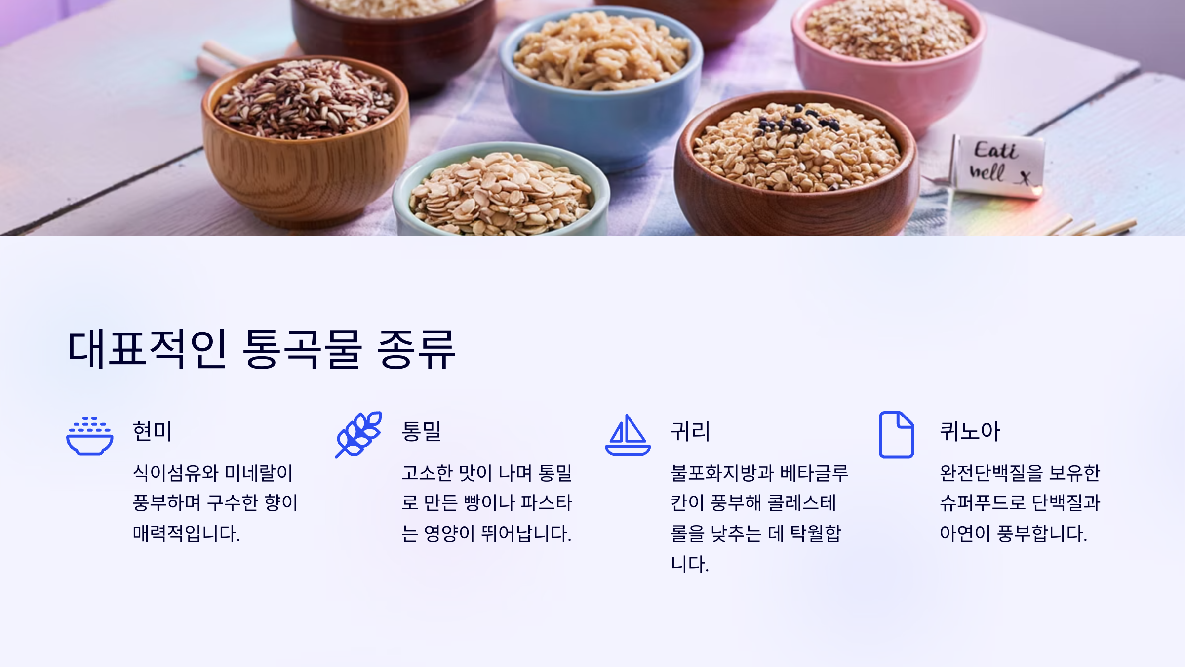 다음 섹션부터는 통곡물이 왜 이렇게까지 주목받는지, 어떤 영양소가 들어 있는지, 그리고 어떻게 먹으면 좋은지 등등 하나하나 살펴볼게요! 🥣