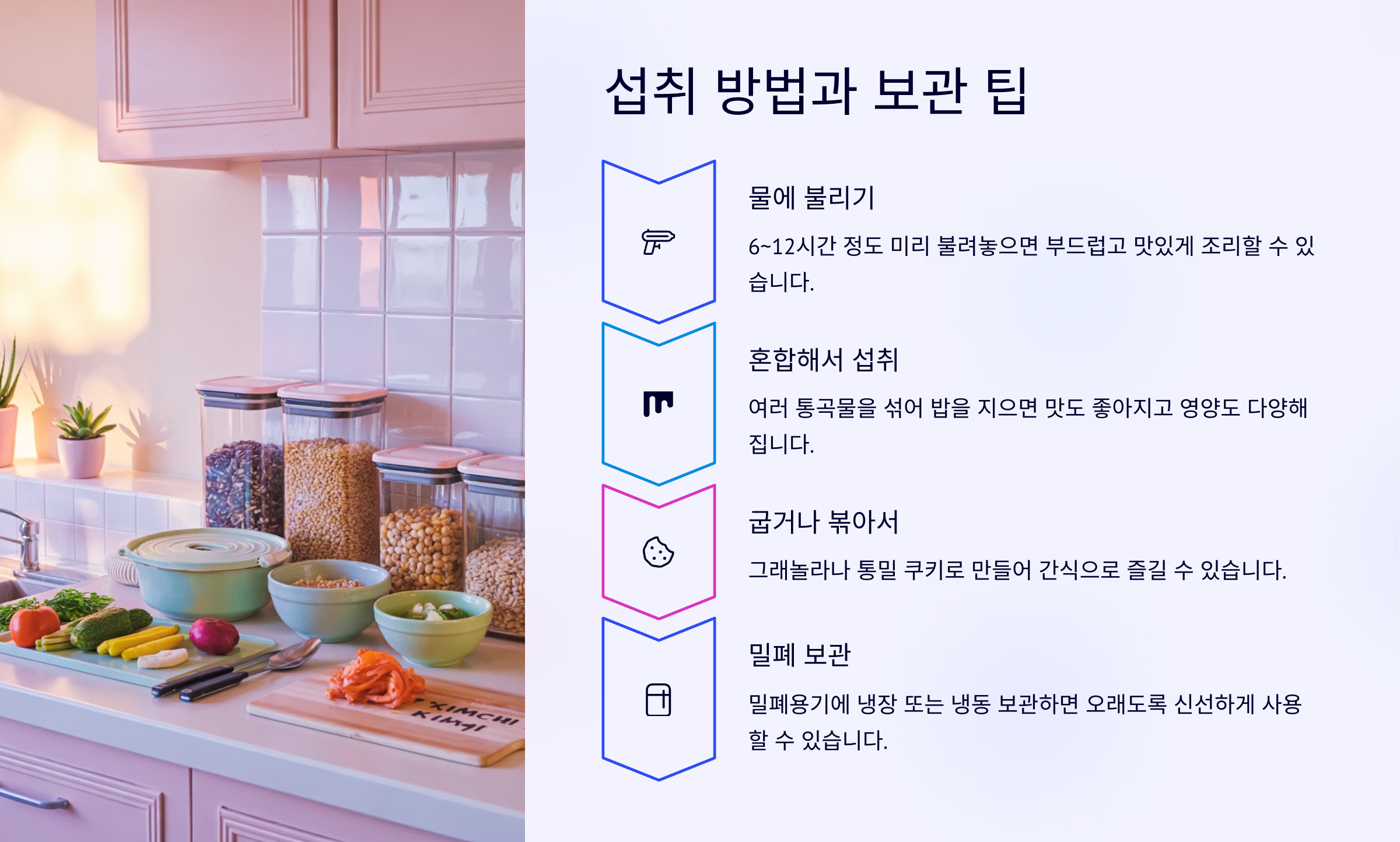 다양한 통곡물들을 요리에 잘 활용하면 지루하지 않고 맛있게 건강을 챙길 수 있어요. 다음 섹션에서는 이런 통곡물들을 어떻게 먹는 게 가장 좋은지, 조리법과 보관 팁까지 알려드릴게요! 🍽