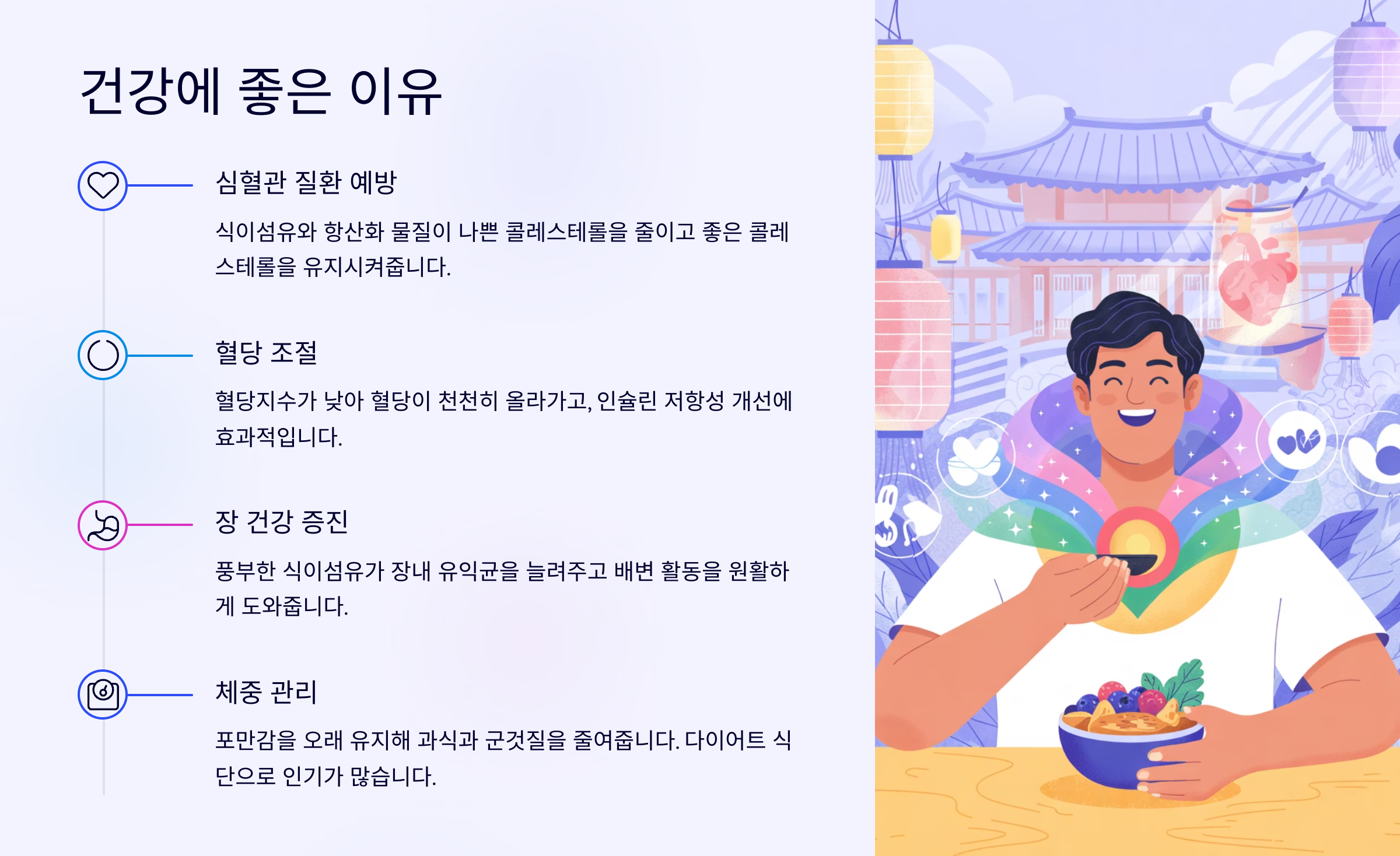 이렇게 다양한 영양소가 듬뿍 들어있는 통곡물은 건강의 핵심이에요. 다음 섹션에서는 이런 통곡물이 우리 몸에 어떤 이점을 주는지, 과학적으로 어떤 효과가 있는지 구체적으로 알아볼게요! 💪