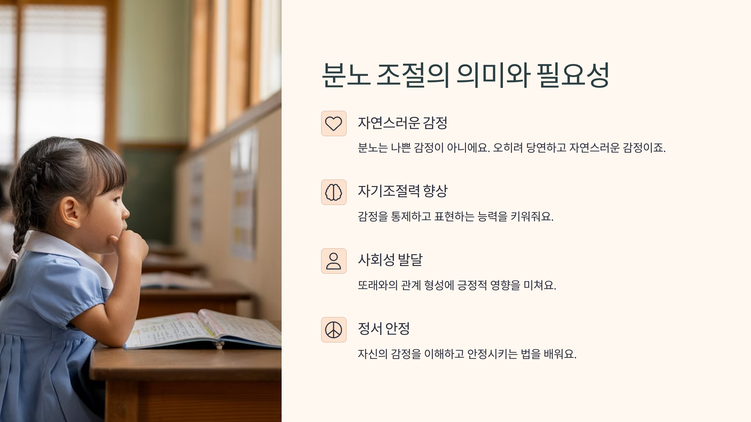 분노 조절 훈련은 아이가 감정을 인식하고 표현하는 방법을 배우는 과정이에요. 어린 시절은 자아가 형성되는 시기라서 감정을 제대로 표현하지 못하면 공격성, 우울, 자기 비하로 이어질 수 있어요. 그렇기 때문에 감정 조절 교육은 단순한 '훈육'이 아니라 평생을 위한 정서 교육이에요.