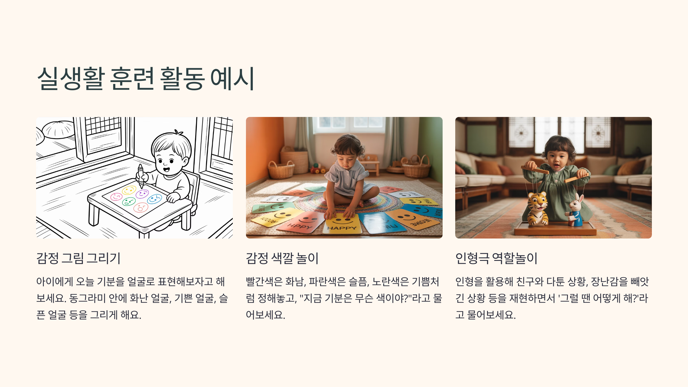 훈련은 책상 앞에서만 이루어지는 게 아니에요. 놀이, 일상 대화, 활동 속에서 자연스럽게 이뤄지는 게 가장 효과적이에요. 아이는 말보다 체험을 통해 더 잘 배우기 때문이에요.