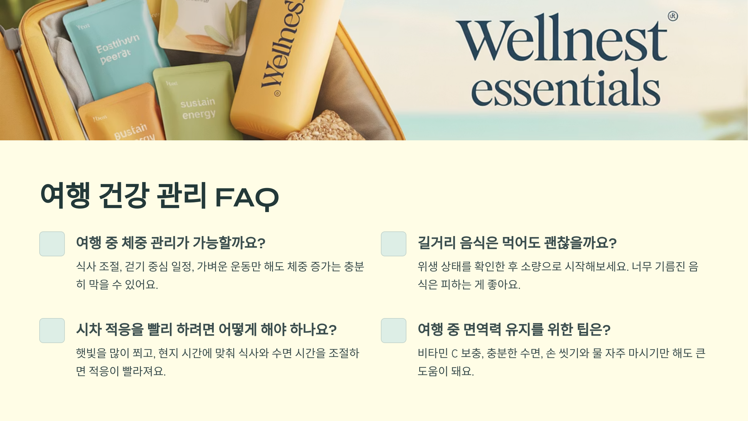 지금부터 섹션별로 하나씩 살펴보면서, 어디서든 건강을 챙길 수 있는 꿀팁들을 알려드릴게요. 여행을 더욱 활기차게 즐길 준비 되셨죠? 😄