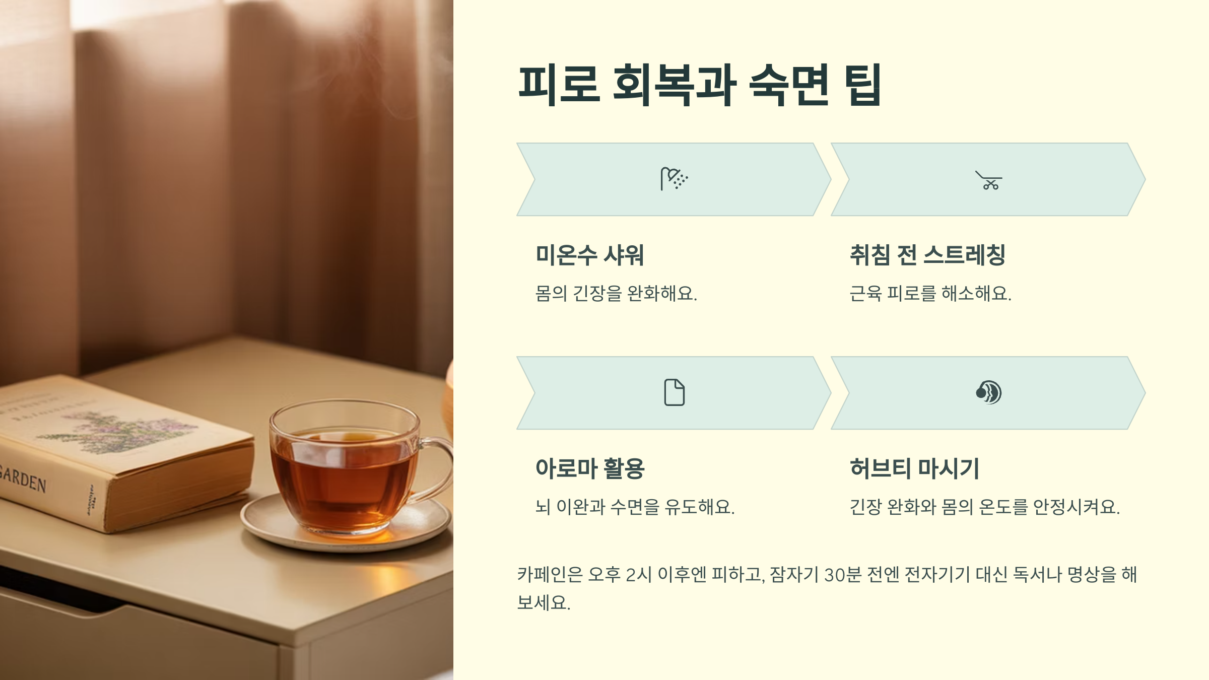 또 하나의 팁은 ‘하루 5분 루틴’을 유지하는 거예요. 아침에 일어나서 스트레칭 3분, 물 한 잔, 가벼운 호흡 명상 2분만 해도 하루가 완전히 달라져요. 이동 중에도 잠깐씩 틈을 내어 몸을 움직여주면 뻐근함이 덜하고 덜 피로해져요.