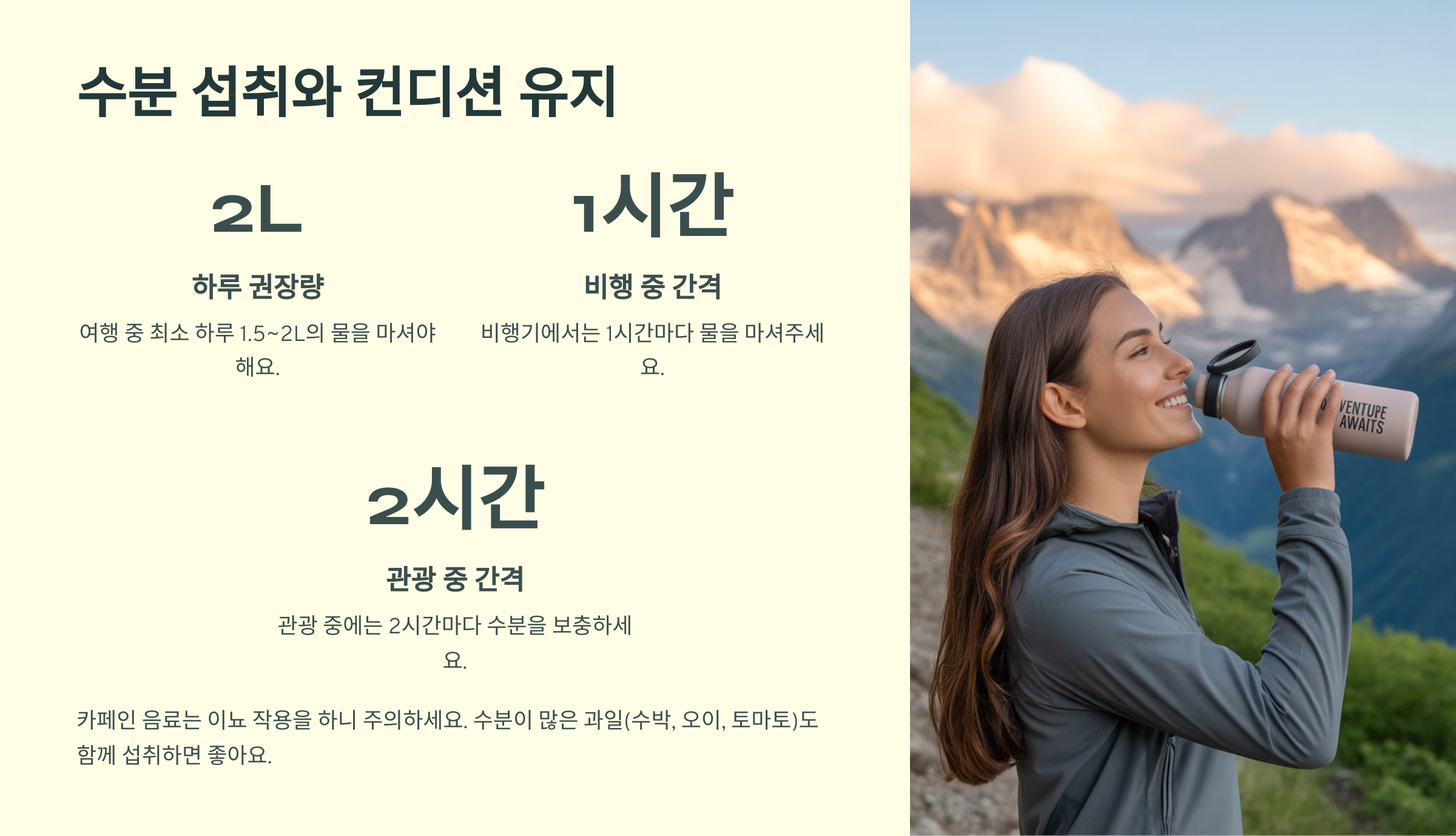 이제 다음 섹션에서는 여행 중 정말 자주 놓치기 쉬운 건강 습관, '수분 섭취'에 대해 이야기해볼게요! 🧃