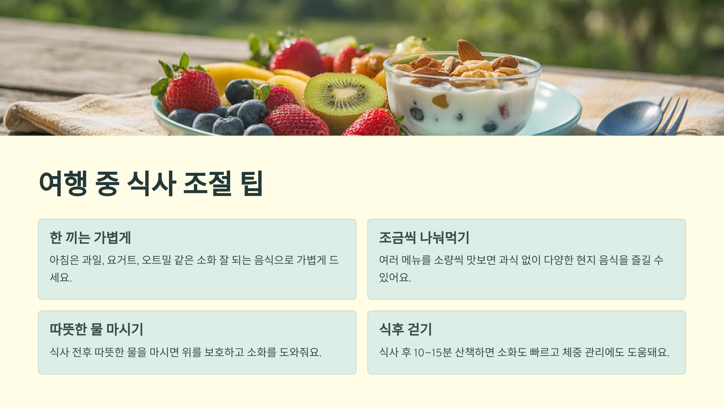 위와 같은 문제들은 간단한 준비와 습관으로 대부분 예방 가능해요. 여행의 설렘은 건강할 때 비로소 빛난다는 걸 꼭 기억하세요. 다음 섹션에서는 여행 중 가장 흔한 고민, ‘식사’에 대해 자세히 알려드릴게요! 🍴