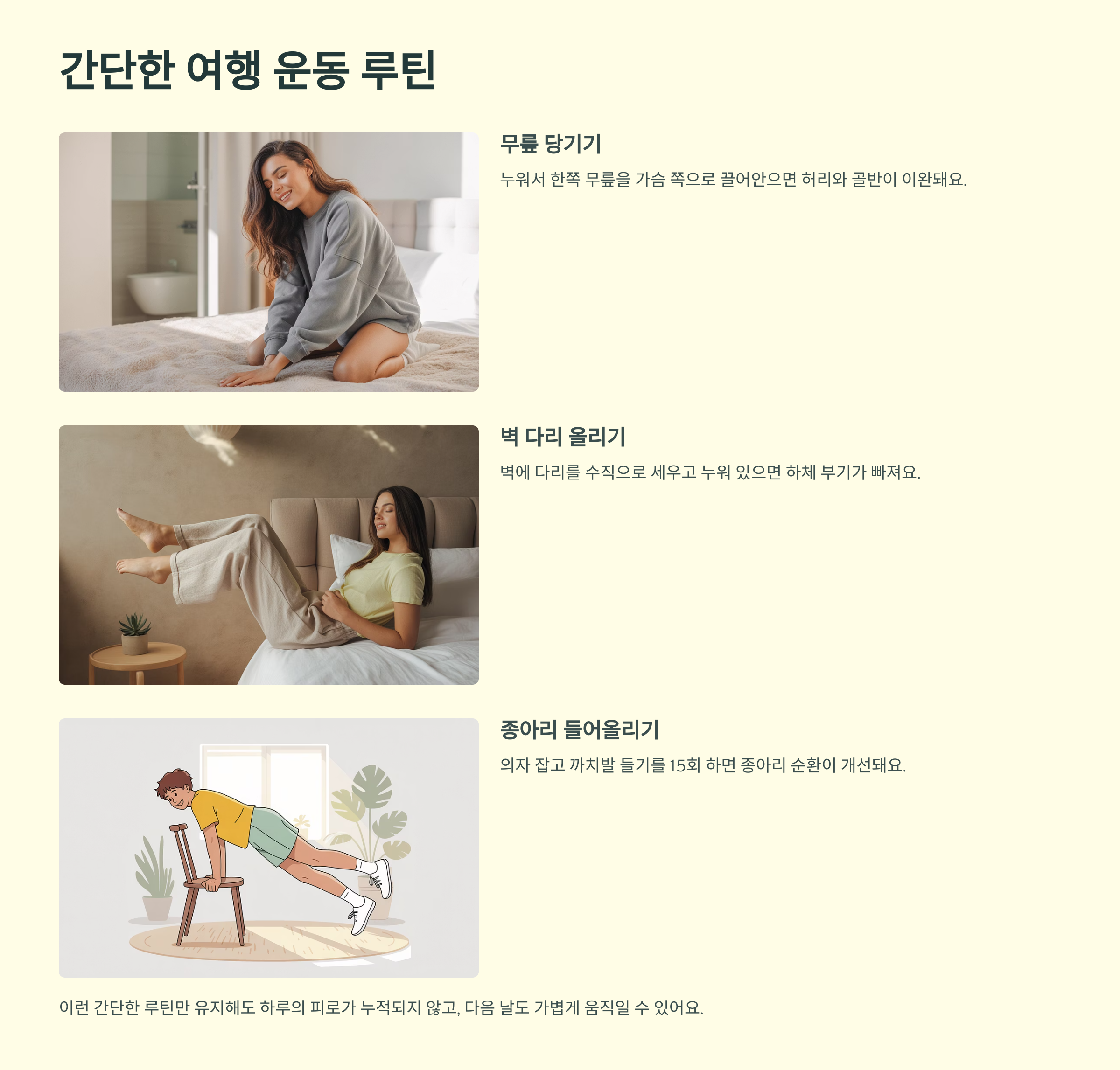 운동이 꼭 헬스장에서 땀 뻘뻘 흘리는 게 아니에요. 숙소 안에서 5분만 투자하면 할 수 있는 동작들이 많아요. 특히 다리 부종 완화나 어깨 결림 방지에 효과적인 스트레칭은 여행 중 정말 유용하답니다.