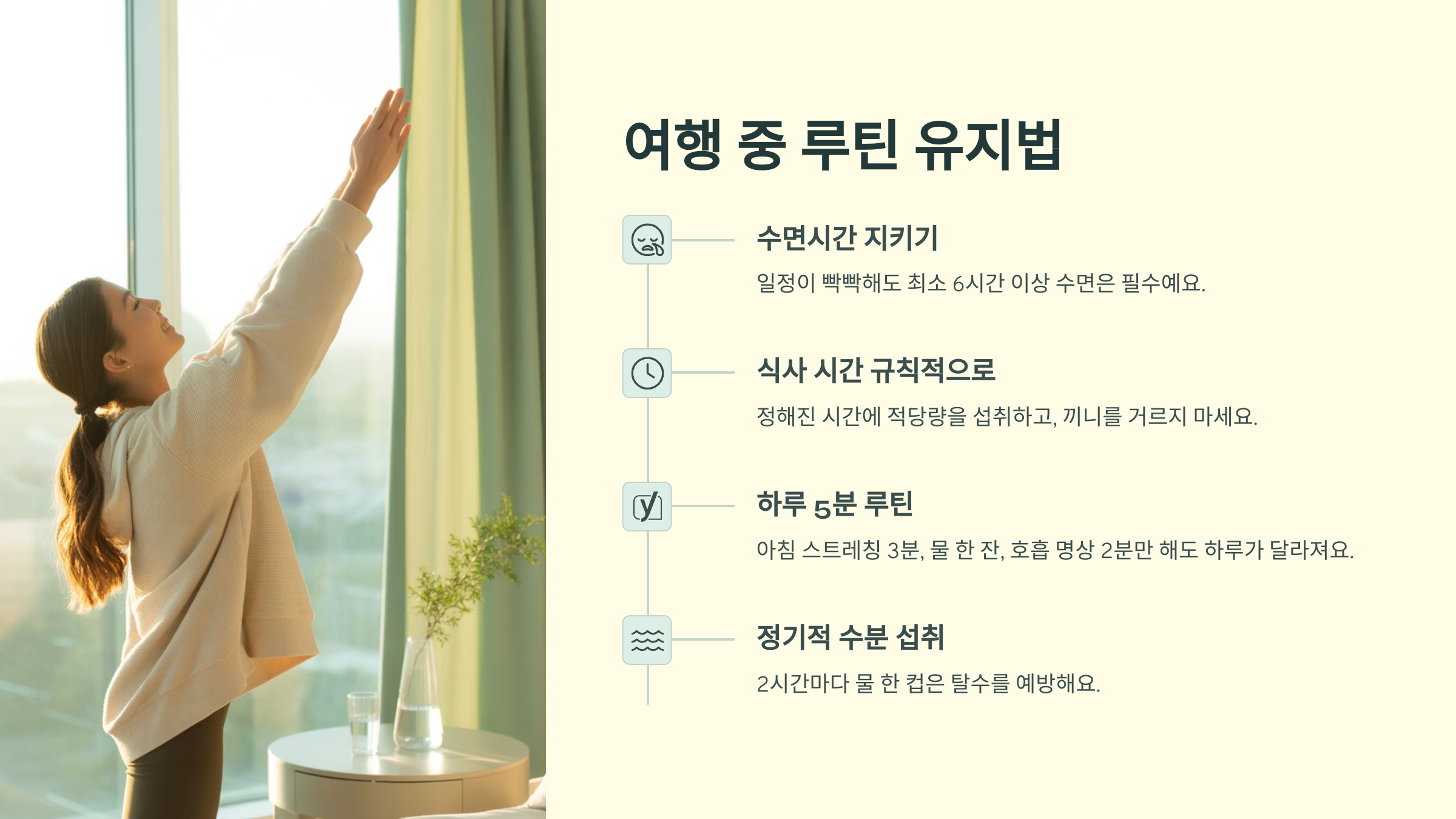 이제 물도 잘 챙기셨다면, 다음 섹션에서는 ‘여행 중 나만의 루틴 유지법’을 알려드릴게요. 일상 루틴을 놓치지 않으면 여행 후에도 무너지지 않는 컨디션을 유지할 수 있어요 ✨