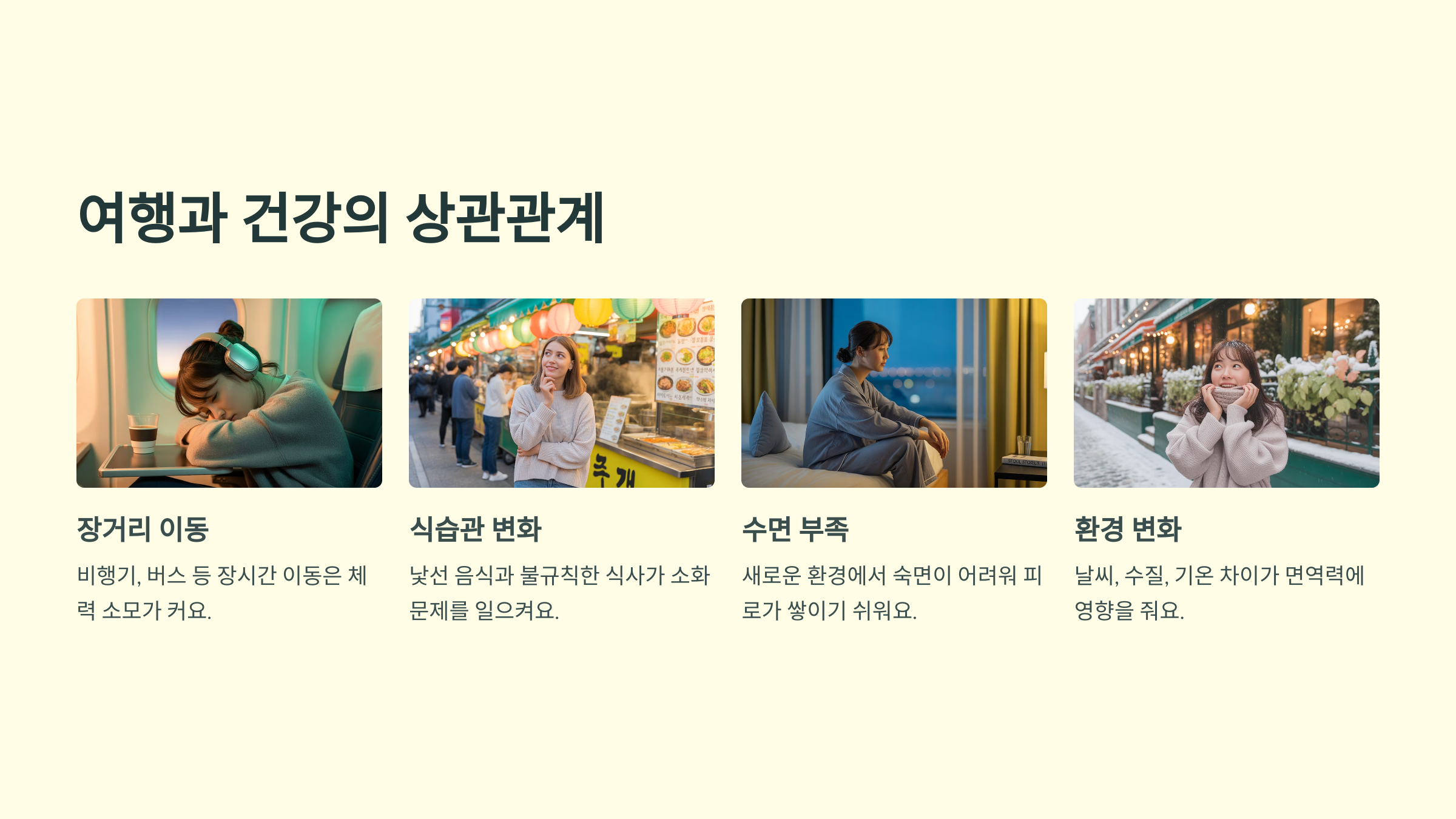 여행은 스트레스를 풀고 새로운 에너지를 얻는 좋은 기회이지만, 동시에 건강 리듬이 깨질 위험도 커요. 특히 장거리 비행, 낯선 음식, 숙면 부족, 걷기 과다 등으로 인해 몸이 쉽게 피로해질 수 있죠. 감기나 장염, 피부 트러블도 여행 중 자주 발생하는 건강 문제예요.