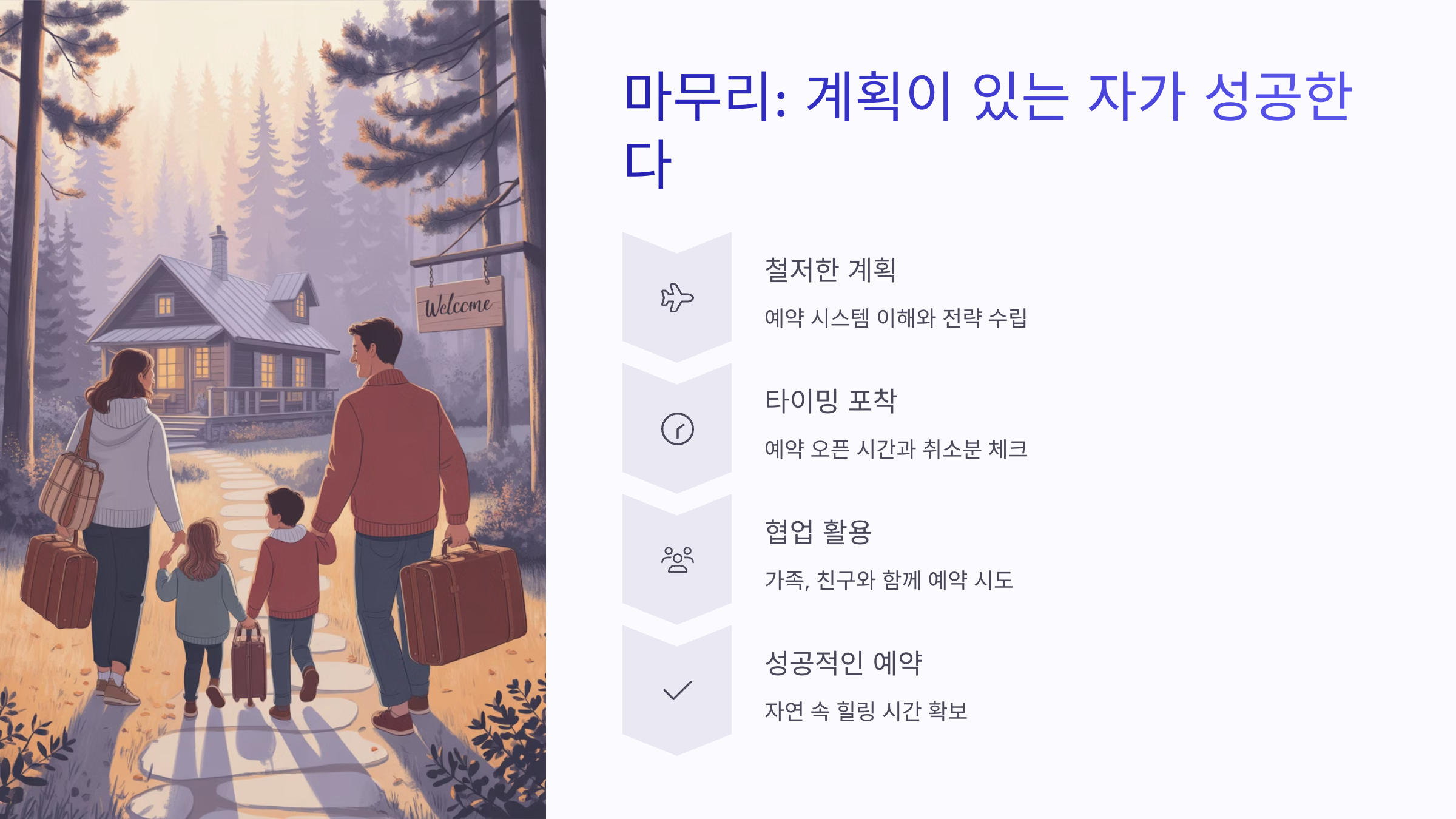 휴양림 예약은 단순한 클릭 싸움이 아닙니다. 계획을 세우고, 전략을 짜고, 타이밍을 보는 치밀한 접근이 필요합니다. 선착순 예약은 빠른 클릭보다 철저한 사전 준비가 중요하고, 추첨 예약은 운보다는 전략이 우선입니다. 취소분 노리기는 꾸준함과 타이밍 싸움이며, 우선예약 제도는 자격이 있다면 반드시 활용해야 할 특권입니다.