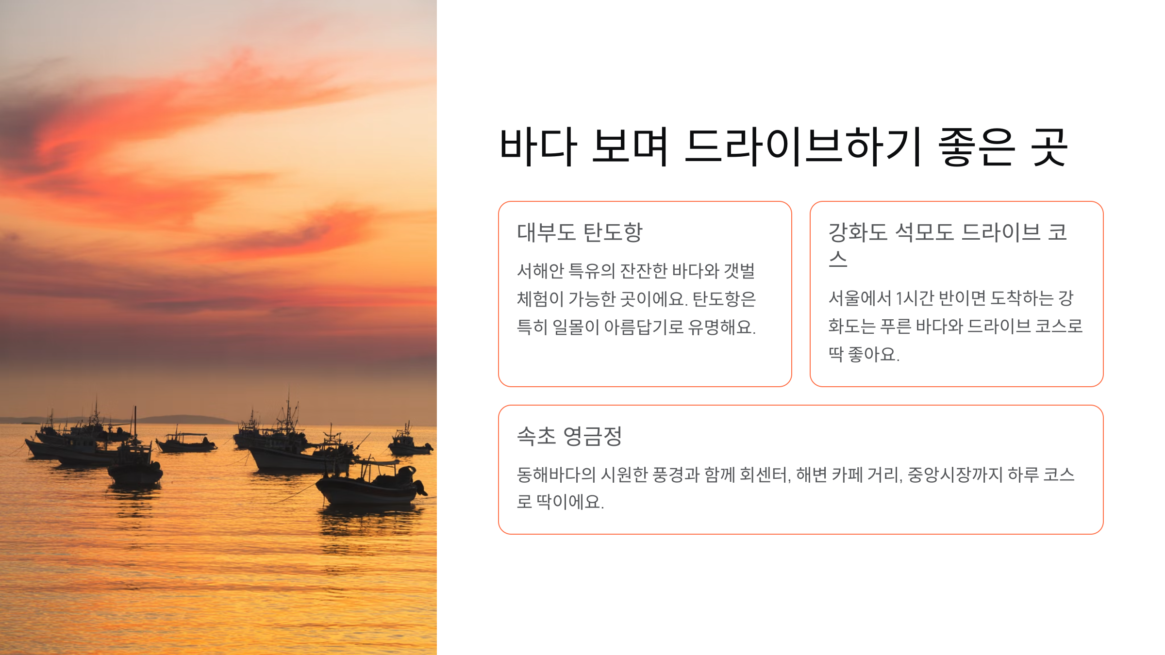 도심 속에 있다 보면 갑자기 바다가 보고 싶을 때가 있어요. 하늘과 맞닿은 수평선, 철썩이는 파도 소리, 바다 냄새만으로도 답답했던 마음이 탁 트이죠. 서울에서 출발해도 당일치기로 충분히 다녀올 수 있는 바다 드라이브 코스를 소개할게요! 🚘