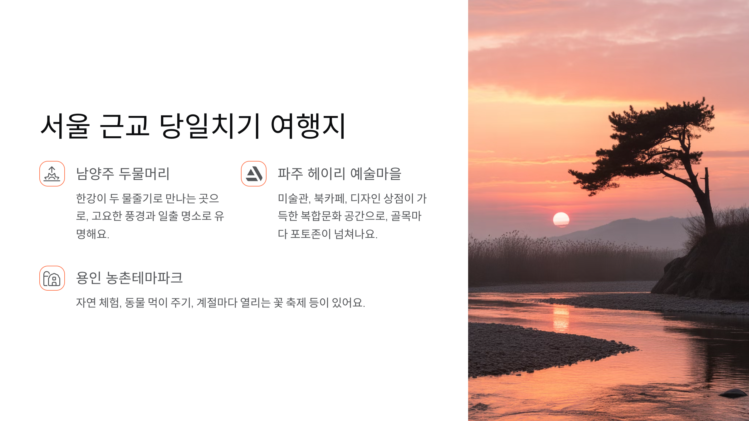 이제부터 서울 근교부터 바다, 자연, 역사까지 테마별 당일 여행지들을 하나씩 소개해드릴게요! 🚗