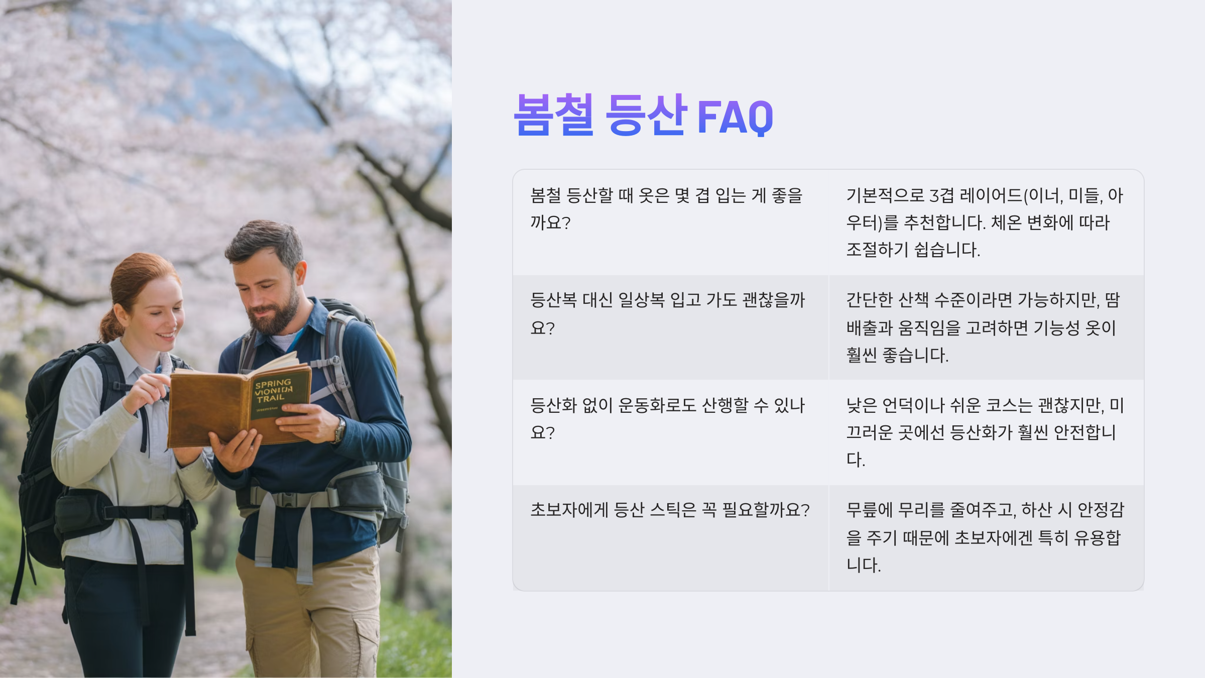 A8. 무릎에 무리를 줄여주고, 하산 시 안정감을 주기 때문에 초보자에겐 특히 유용해요.