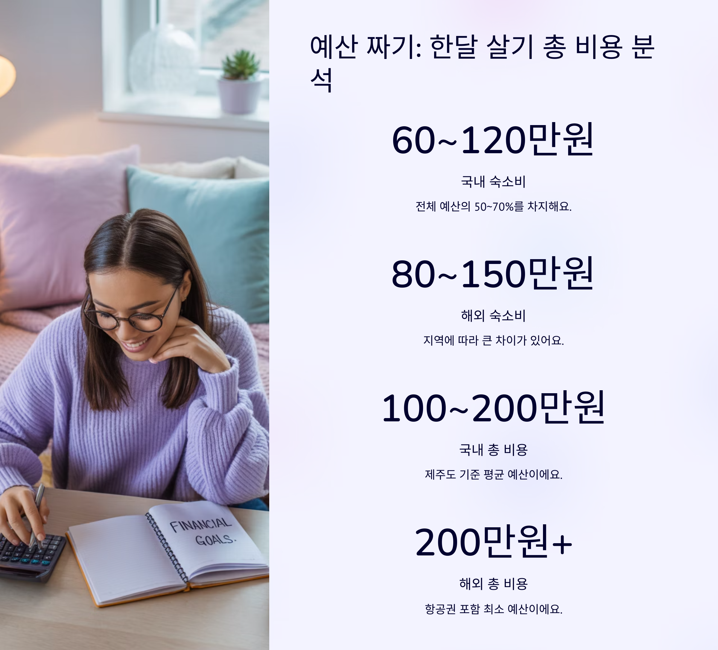 예를 들어 제주도에서 한달 살기를 한다면 숙소 비용은 50만~120만 원까지 다양해요. 여기에 교통비(렌트카 또는 버스), 식비, 카페 이용 비용 등을 더하면 평균적으로 100만~200만 원 선에서 조절할 수 있어요. 반면, 해외의 경우 항공권을 포함하면 기본 200만 원 이상은 생각해야 해요.