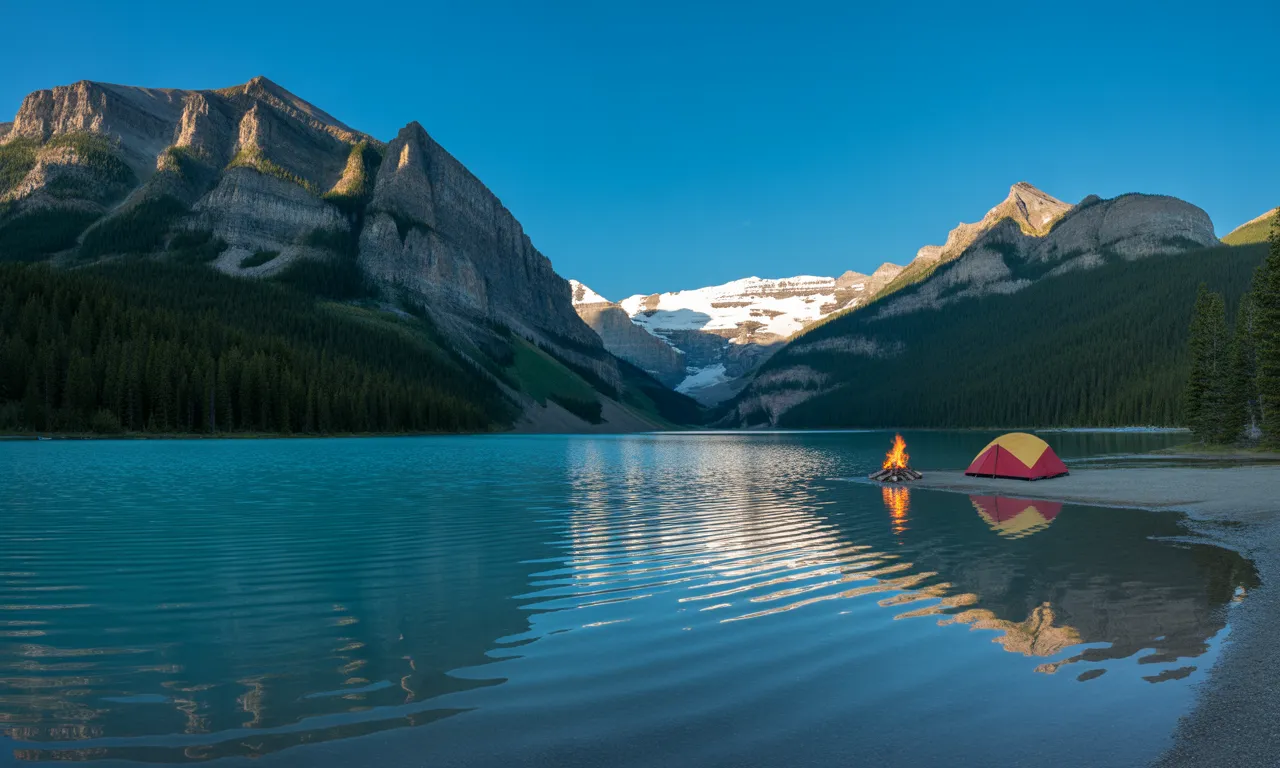 밴프는 빙하호수와 산악 지형이 어우러진 고요한 낙원입니다. 특히 레이크 루이스 근처 캠프장은 하이킹 후 차가운 호수 물에 발을 담그는 경험이 특별합니다.