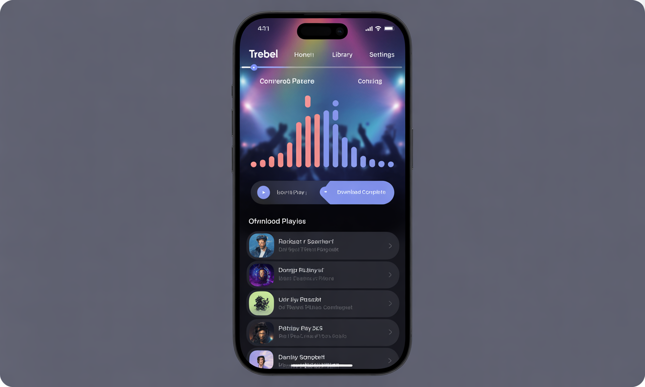 Trebel은 다른 무료 앱과 다르게, 음원을 완전히 다운로드하여 광고 없이 오프라인에서도 감상할 수 있도록 설계되었습니다.
