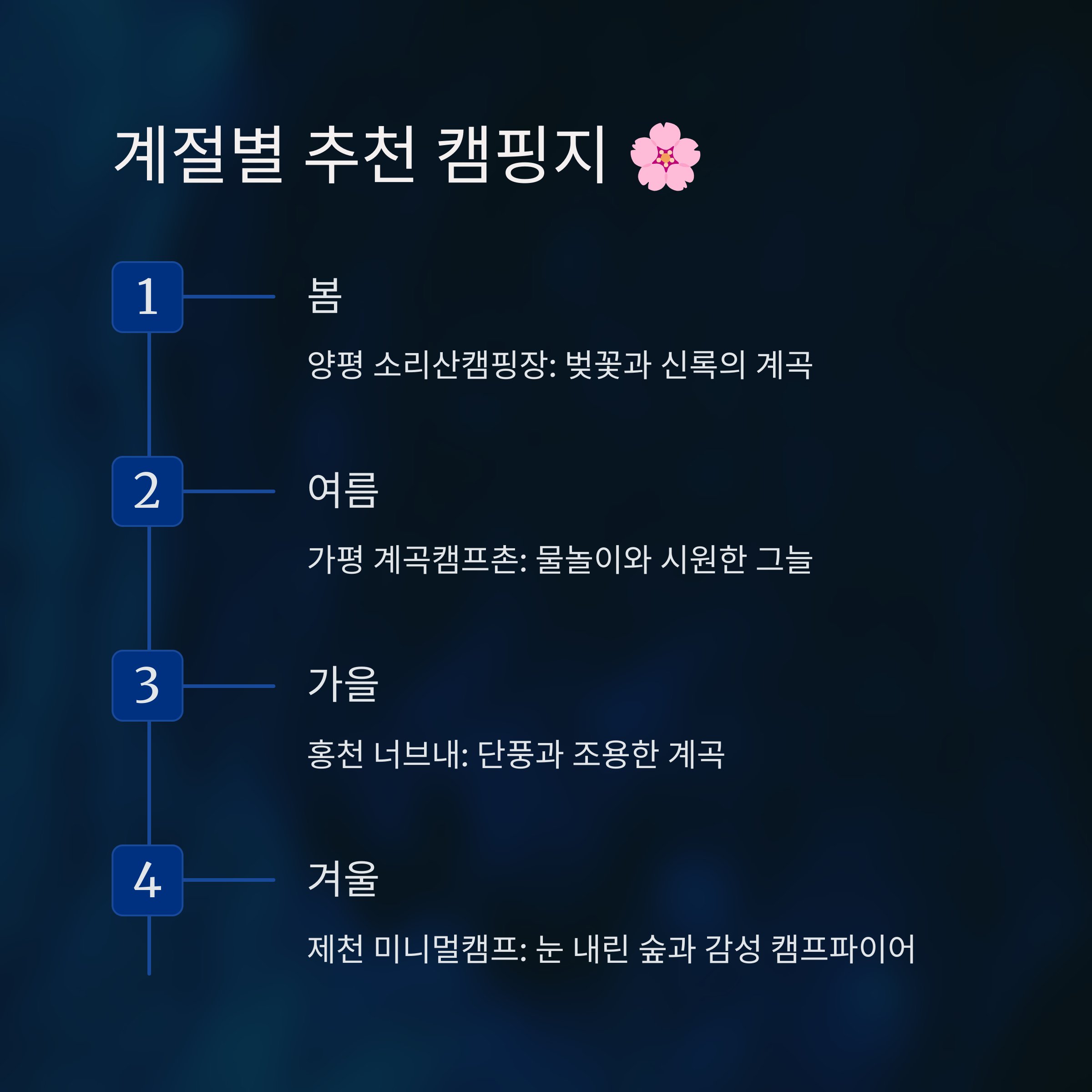 - 봄 (4~5월) – 양평 소리산캠핑장: 벚꽃과 신록이 아름다운 계곡 옆