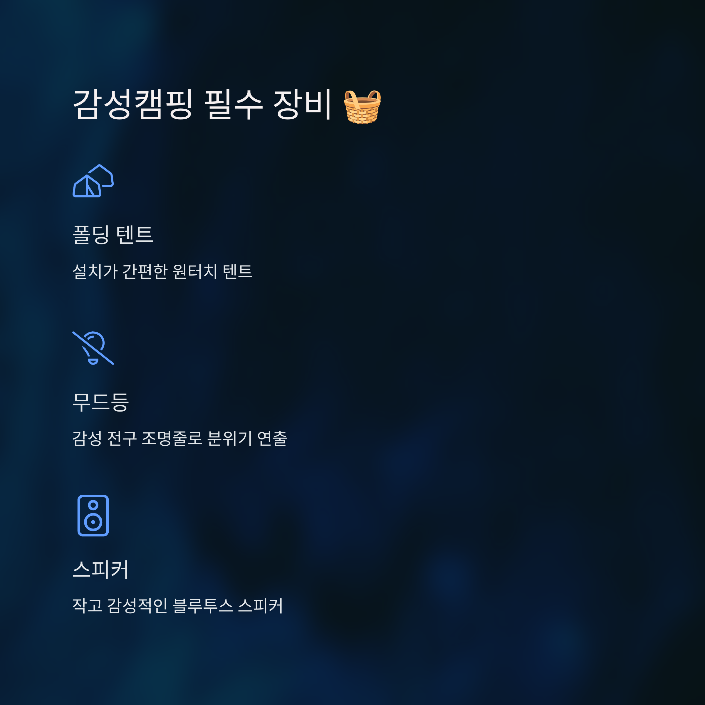 🎪 폴딩 텐트 or 원터치 텐트 (설치 간편) 💡 감성 무드등, 전구 조명줄 🪵 캠핑 체어+미니 테이블 세트 🍷 와인잔 or 예쁜 머그컵 (분위기 필수템) 🎶 블루투스 스피커 (작고 감성적인 디자인 추천) 🔥 휴대용 화로대 (마시멜로 or 군고구마 구이용) 🧺 감성 피크닉 매트 or 러그 📷 즉석카메라 or 폴라로이드
