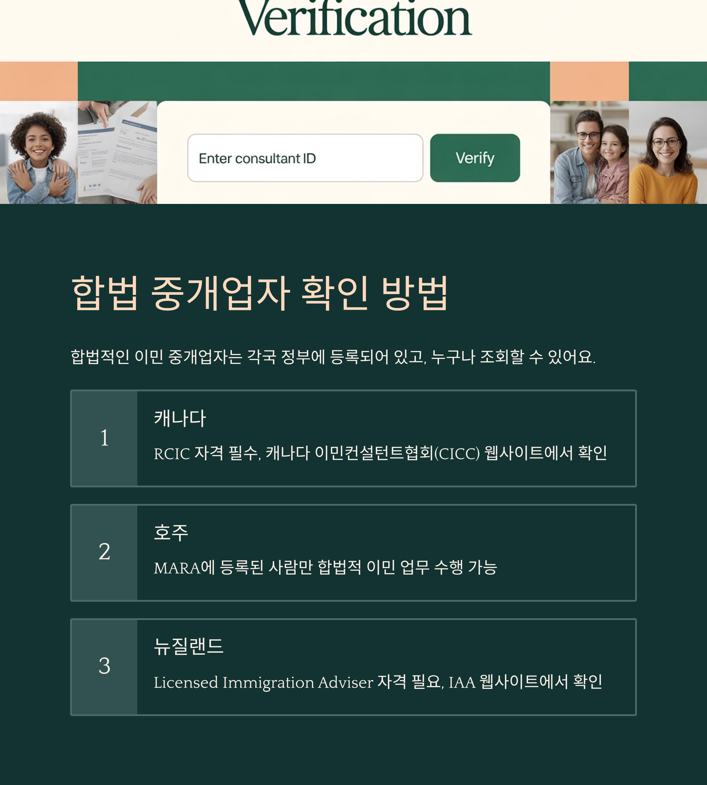 예를 들어, 캐나다의 경우 ‘RCIC(Registered Canadian Immigration Consultant)’라는 자격이 있는 사람만 이민 컨설팅을 할 수 있어요. 이들은 캐나다 이민컨설턴트협회(CICC)에 등록돼 있고, 공식 웹사이트에서 성명이나 번호로 검색할 수 있어요.