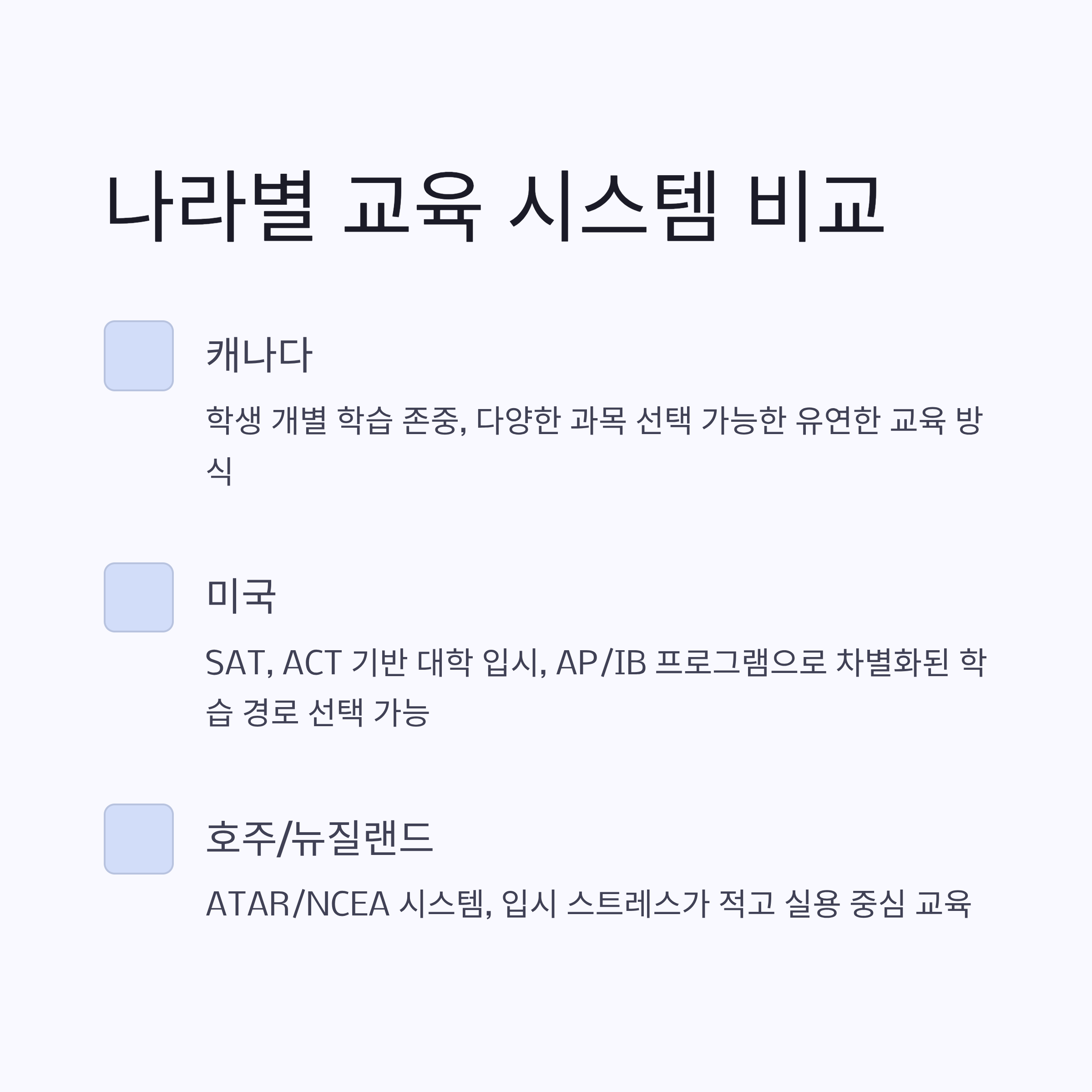 각국의 교육 시스템은 구조부터 평가 방식, 대학 진학 제도까지 매우 다양해요. 예를 들어 캐나다는 주마다 교육과정이 다르지만, 공통적으로 학생 개별 학습을 존중하고, 다양한 과목 선택이 가능하다는 점에서 유연한 교육 방식이 강점이에요.