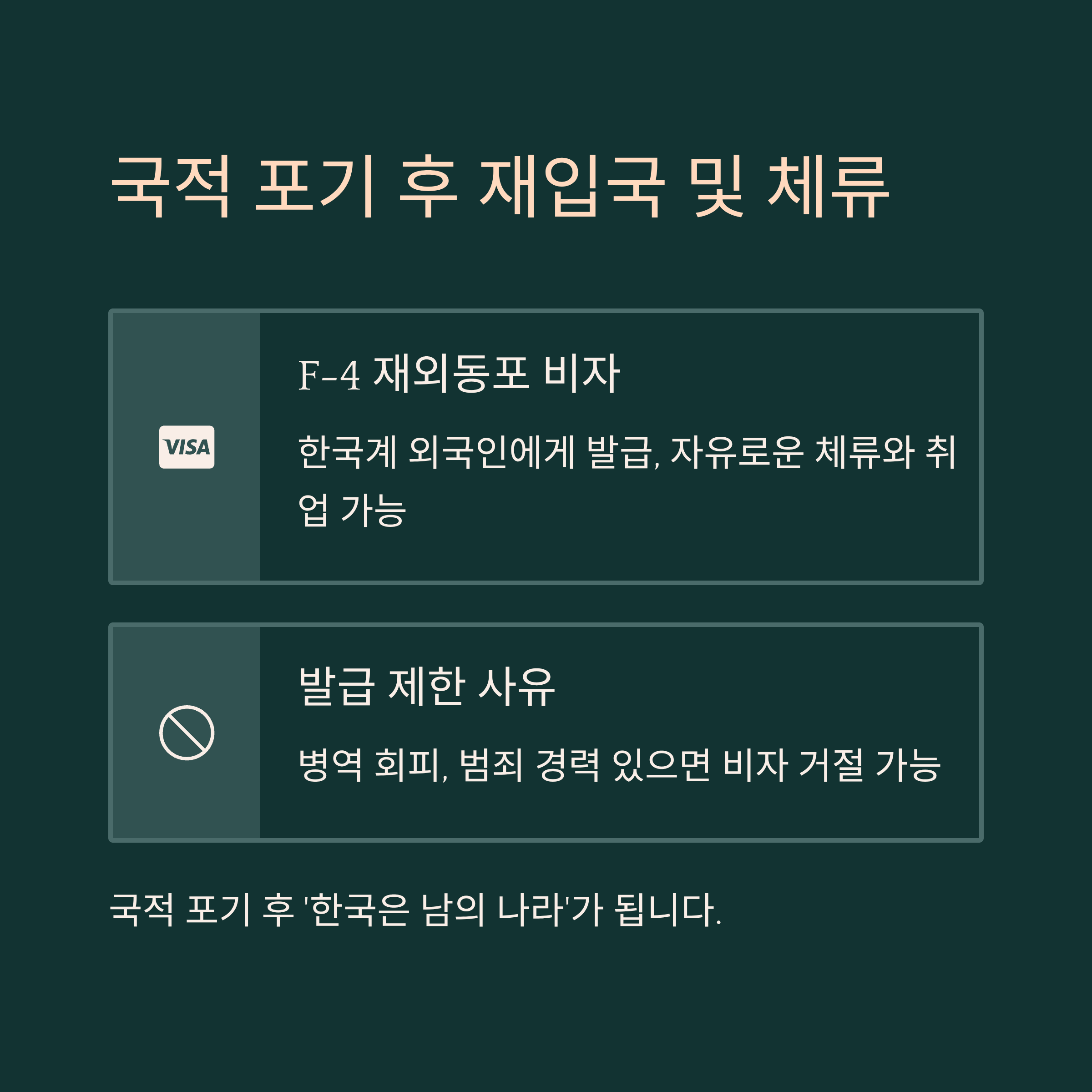 4️⃣ **재입국 제한 가능성** 국적 포기 사유가 병역 회피로 의심될 경우, 한국 입국 자체가 금지되거나 비자 거절될 수 있어요.