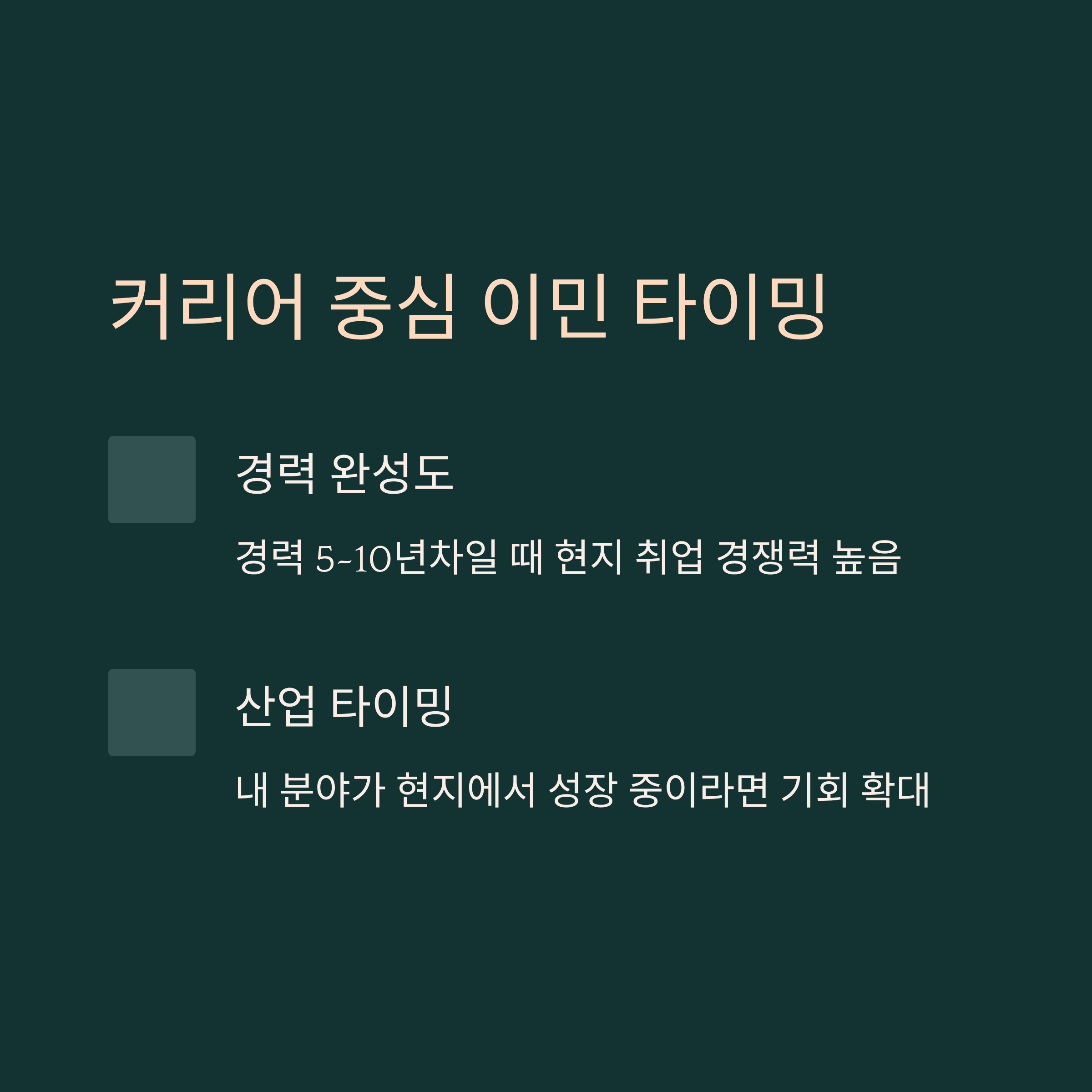 결국 커리어 중심 이민 타이밍의 핵심은 ‘경력 완성도’와 ‘산업 타이밍’이에요. 이 두 가지가 동시에 맞아떨어질 때, 이민 후 빠른 경제적 안정을 이룰 확률이 높아요.