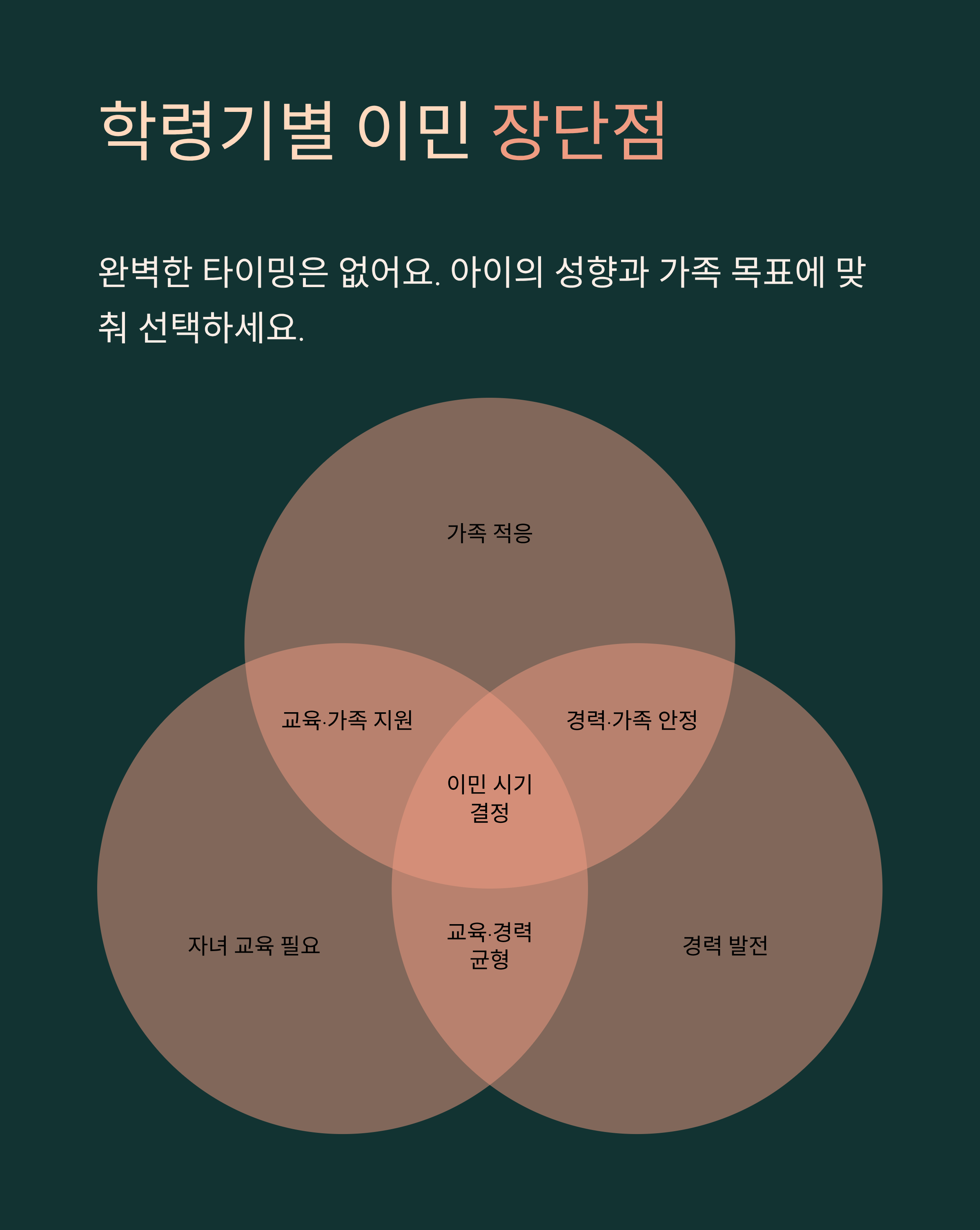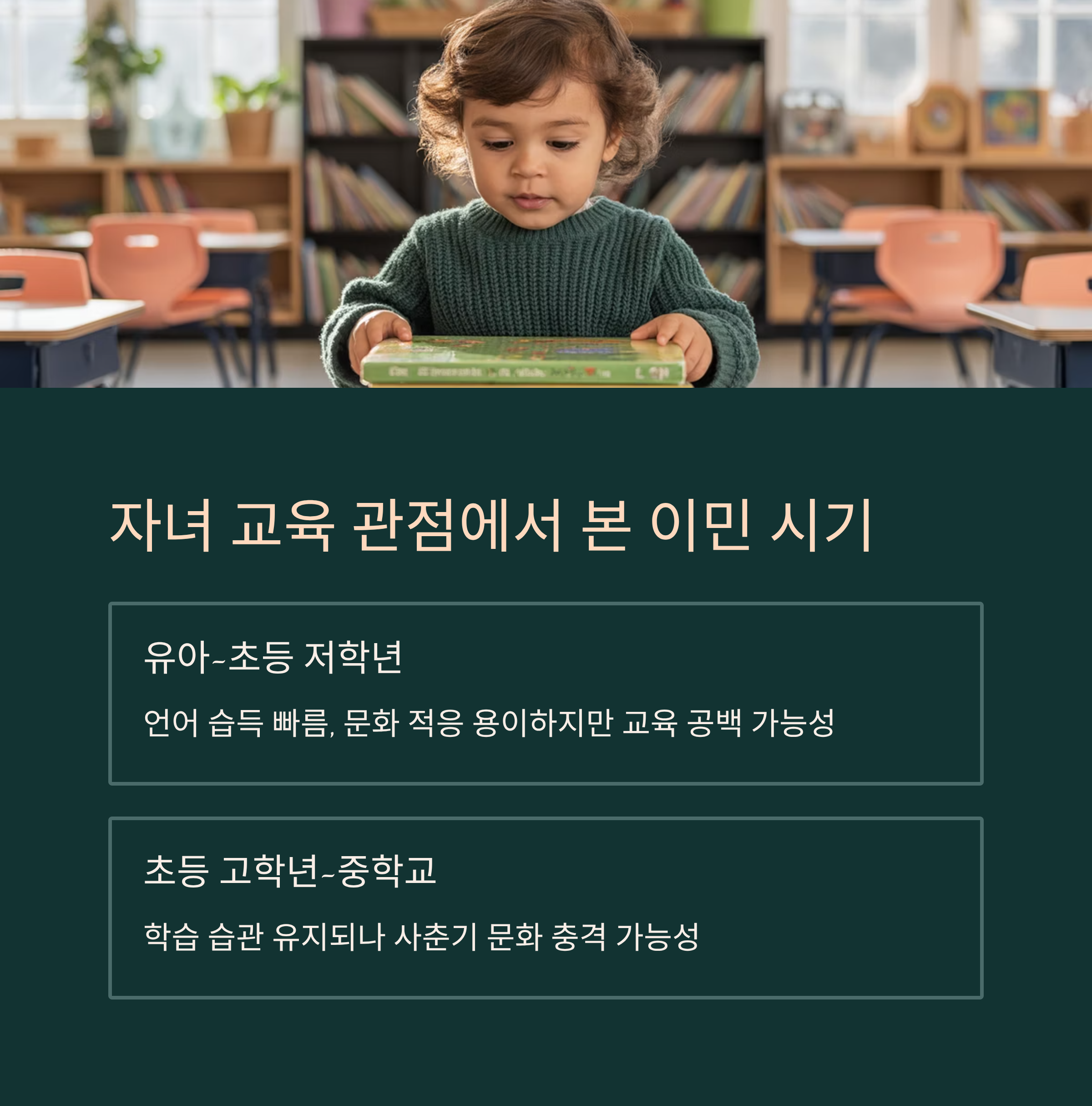 이민 시기 결정은 결국 아이의 성향과 학습 태도, 그리고 가족의 장기 계획에 달려있어요. 단순히 나이만 보고 결정하는 것은 위험하죠.