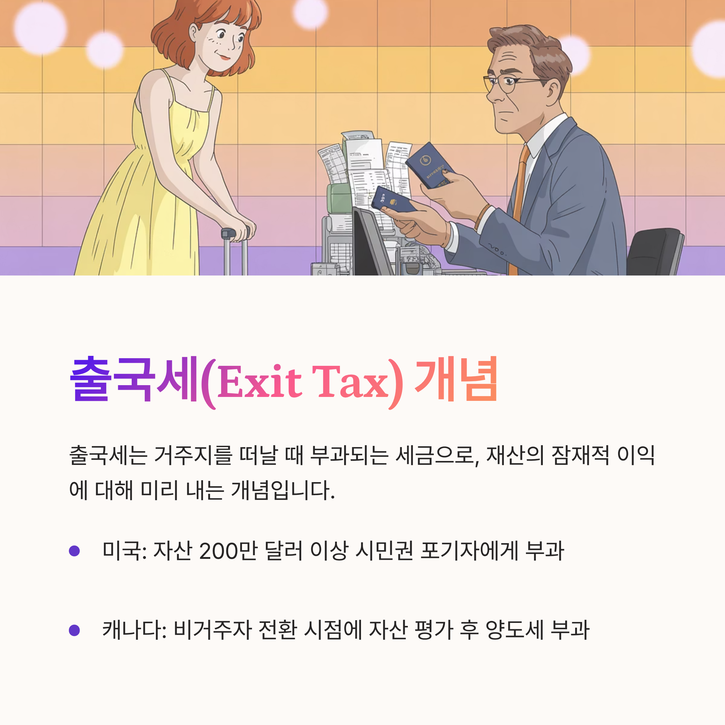 미국은 일정 소득과 자산을 가진 시민권자가 시민권을 포기하거나 영주권을 반납할 때, 자산을 매각한 것으로 간주해 과세하는 출국세를 부과해요. 캐나다도 비슷하게 비거주자로 전환되는 시점에 자산 평가를 하여 양도차익을 계산한 뒤 세금을 내게 하죠.