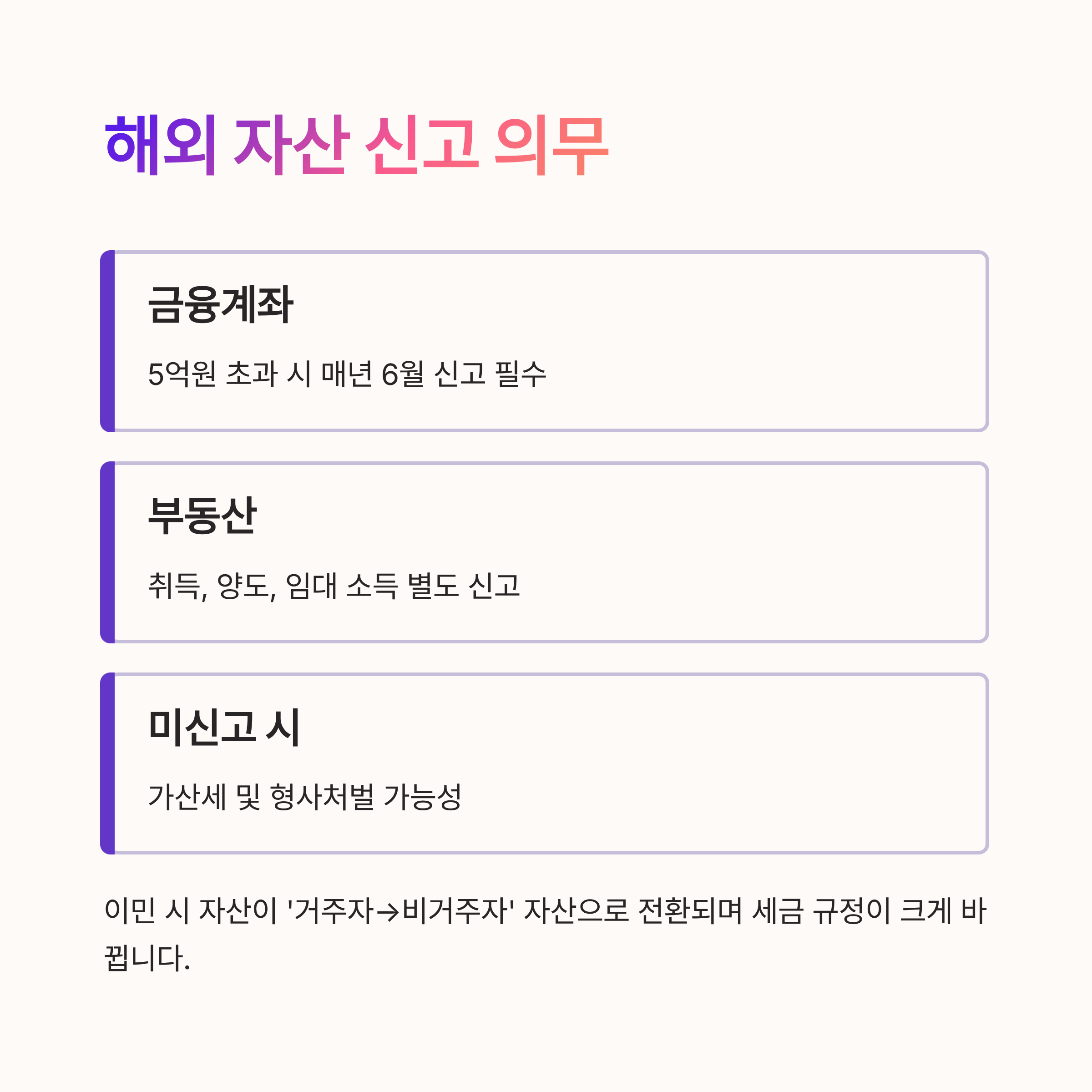 해외 자산 신고는 단순한 의무를 넘어서, 향후 세무 조사의 리스크를 줄이는 중요한 과정이에요. 특히 이민을 앞둔 경우, 해외 자산의 위치와 가치, 과세 여부를 미리 정리하는 게 필수랍니다.