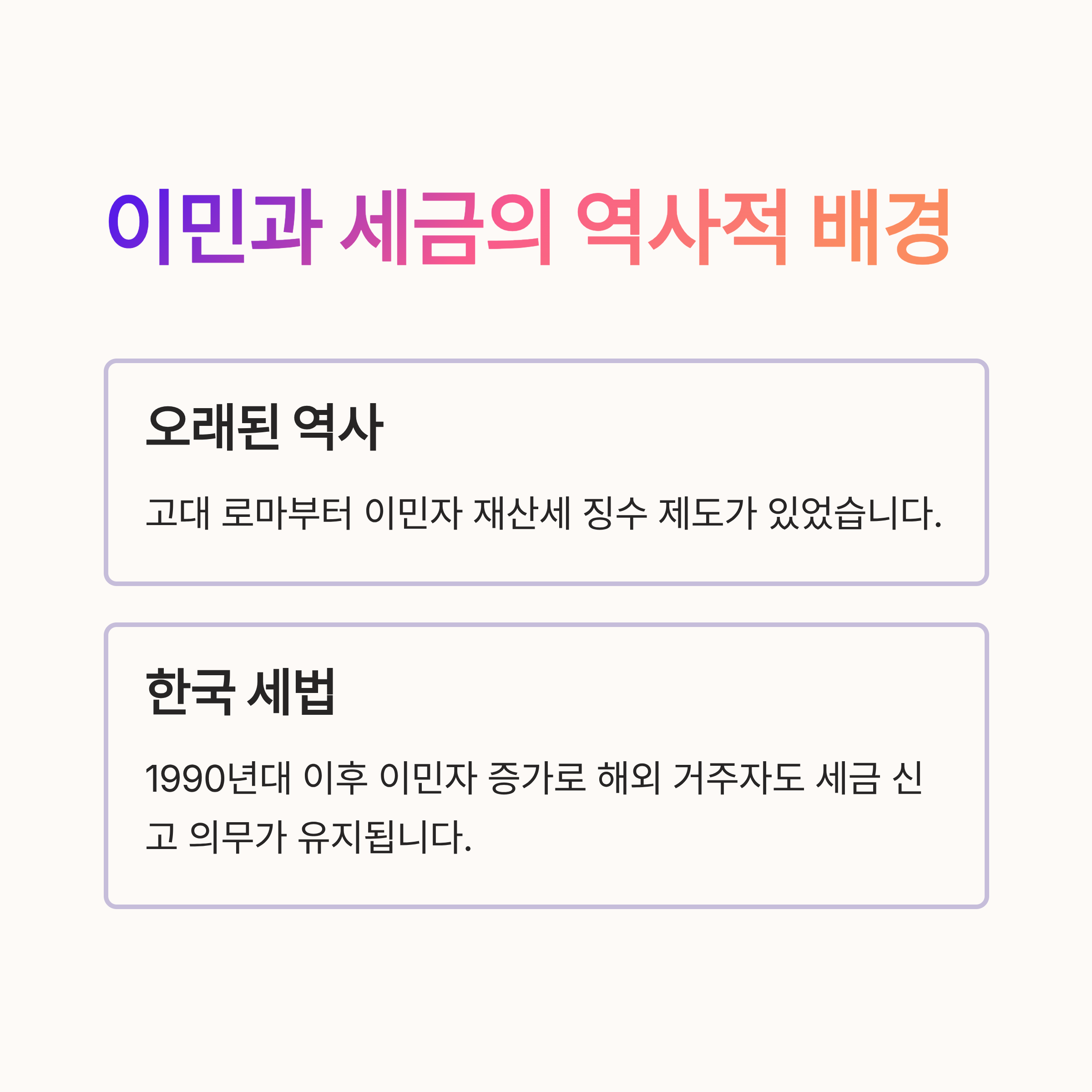 이민과 세금의 관계는 생각보다 오래된 역사적 뿌리를 가지고 있어요. 고대 로마 시대에도 시민이 해외로 나갈 경우 일정 재산세를 부과하거나 귀국 시 세금을 징수하는 제도가 있었답니다. 국가 입장에서 국민이 다른 나라로 나가면 세수(稅收) 손실이 발생하기 때문에, 이를 보완하려는 움직임은 오래전부터 이어졌어요.