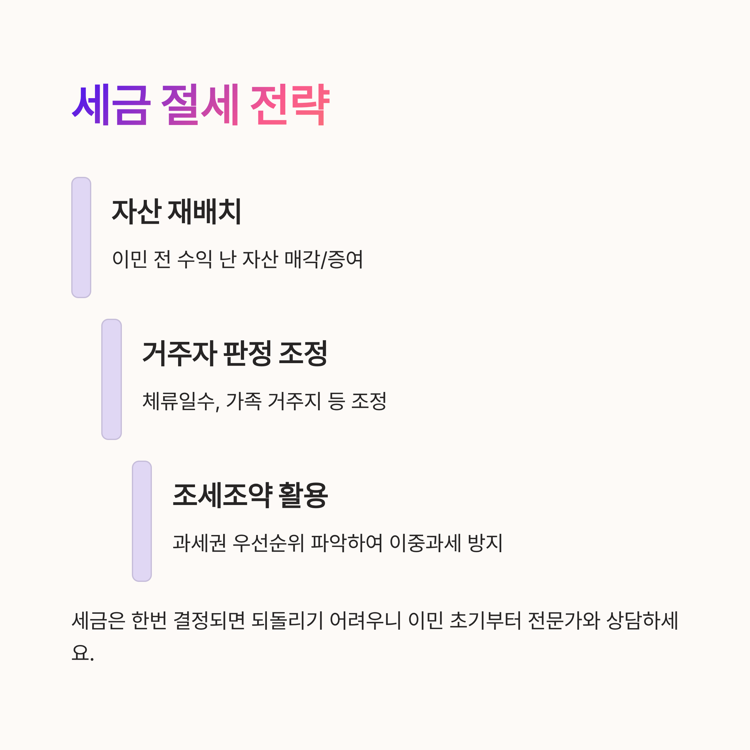 | 조세조약 활용 | 과세권 우선순위 파악 | 이민 준비 단계 |