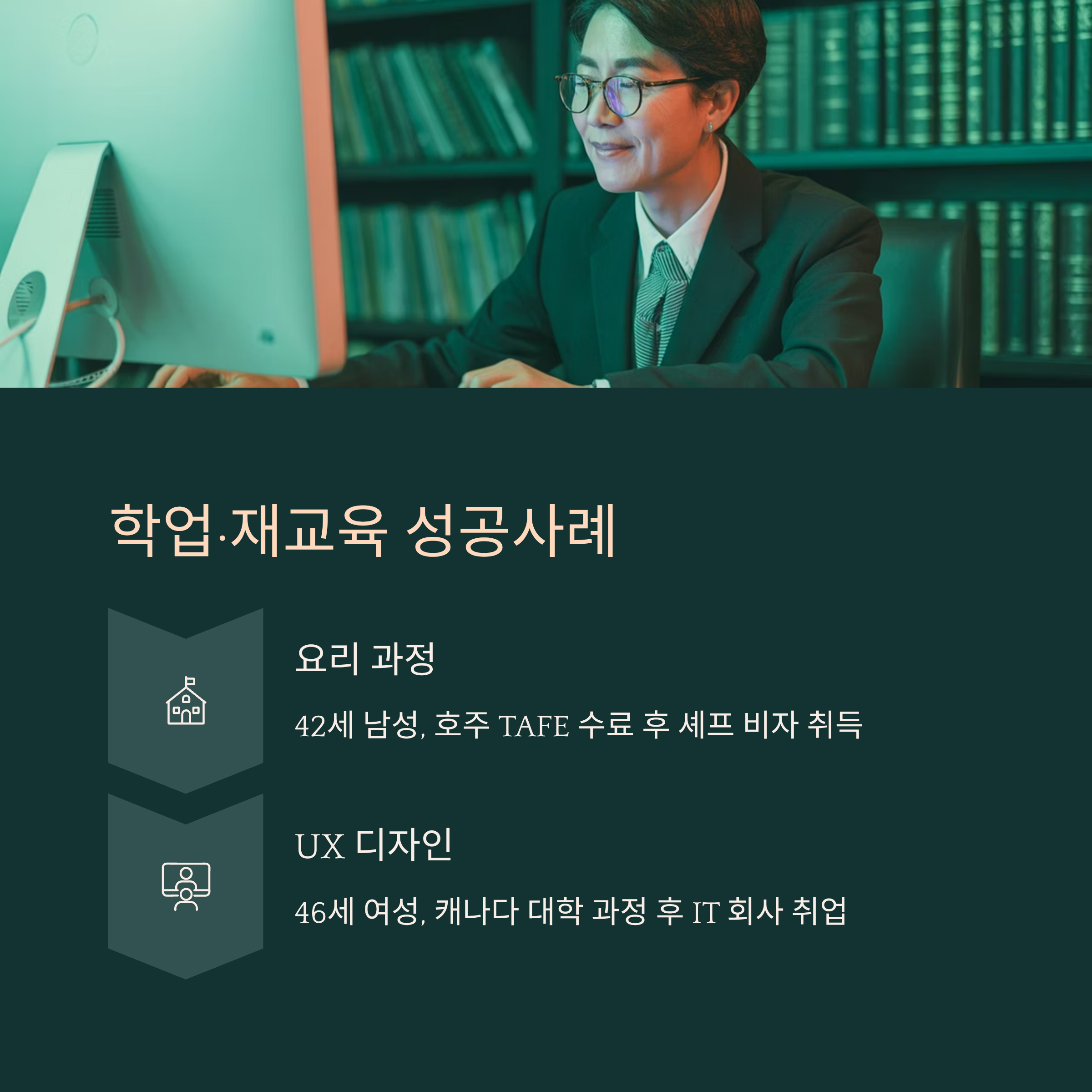 40대에도 새로운 학업이나 전문기술을 배워서 이민에 성공하는 사람들이 있어요. 대표적으로, 간호·요리·IT 관련 학위를 새로 취득해 취업 비자를 받는 케이스죠. 예를 들어, 한 42세 남성은 호주 TAFE(공립 직업학교)에서 요리 과정을 수료하고 셰프 비자를 받아 정착했어요.