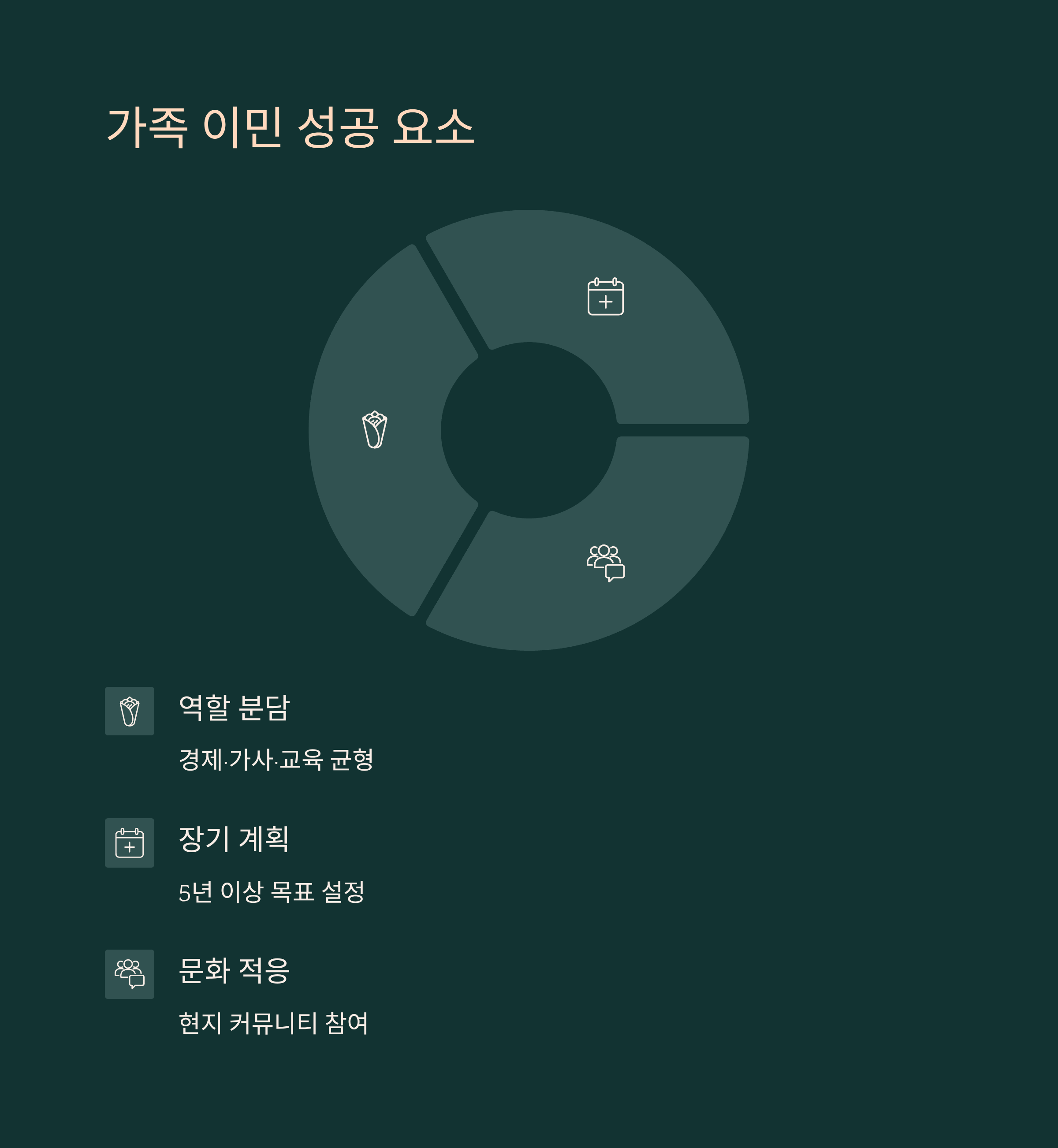 가족 이민의 핵심은 모두가 만족할 수 있는 ‘역할 분담’이에요. 경제적인 부분뿐만 아니라 가사와 자녀 교육, 문화 적응까지 균형 있게 나눠야 해요. 가족 중 한 명만 행복하면 나머지 구성원이 힘들어질 수 있으니까요.