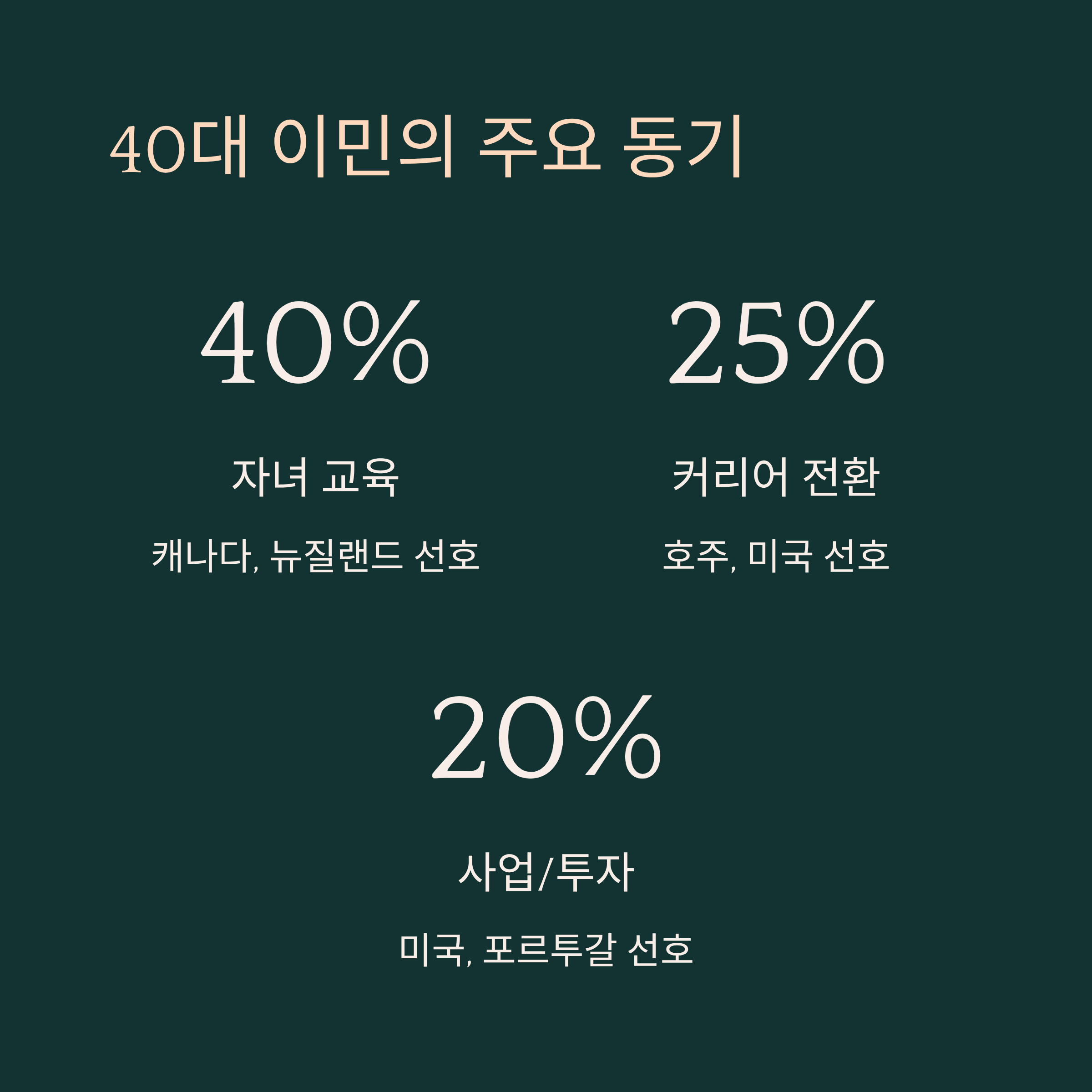 이 표를 보면 알 수 있듯, 40대 이민의 가장 큰 이유는 자녀 교육이에요. 하지만 커리어 전환과 사업 기회도 무시 못할 만큼 중요하죠. 본인의 상황에 맞는 동기를 정확히 파악해야 성공 확률이 높아져요.