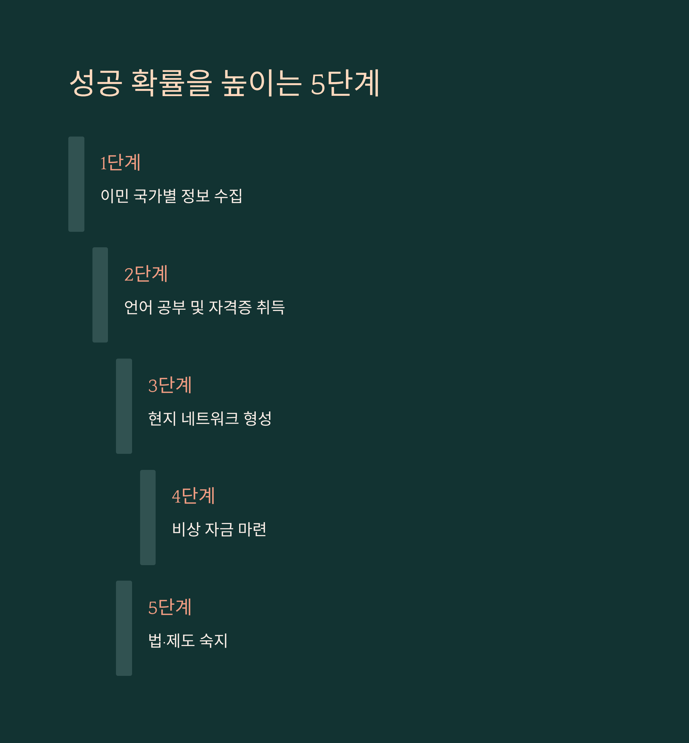 세 번째는 ‘현지 네트워크’예요. 온라인 커뮤니티나 SNS, 현지 한인회 등을 활용하면 초기 정착 과정이 훨씬 수월해져요. 네 번째는 ‘재정 관리’예요. 최소 1~2년간은 안정적인 수입이 없을 수도 있으니 충분한 비상 자금을 확보하는 게 필수예요.
